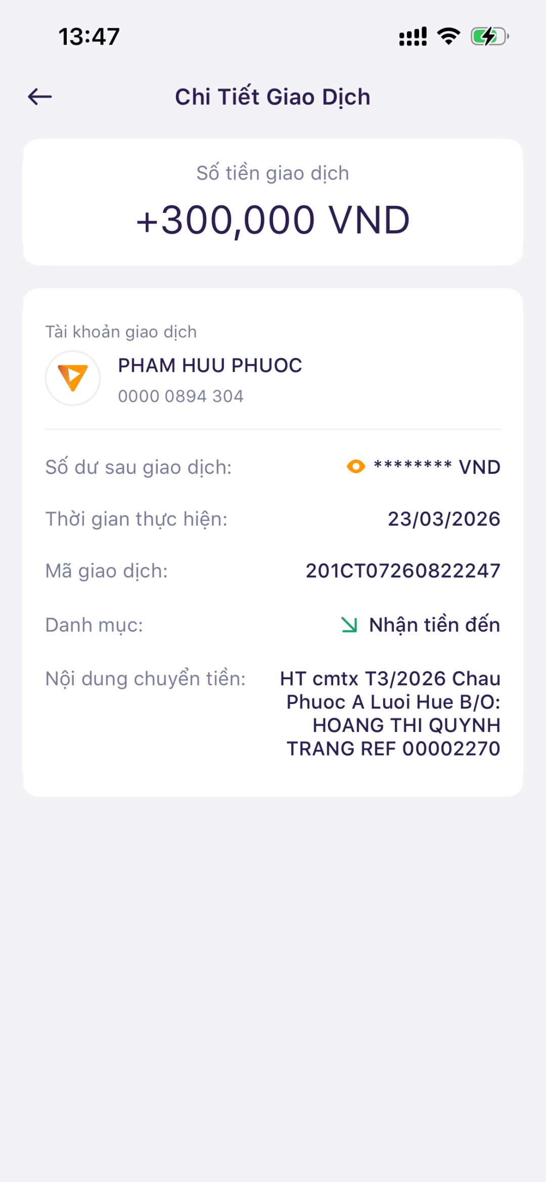 Cháu xin xác nhận đã nhận được tiền từ cô Hoàng Thị Quỳnh Trang cmtx t3/2026 ạ!.