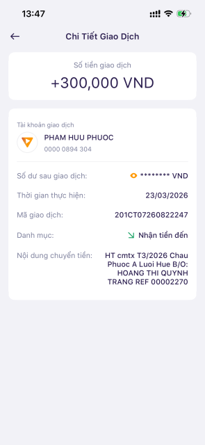 Bạn HT sẽ CMTX 300.000đ/tháng Phước từ tháng 3 đến hết 2026, Vịt đã chuyển cmtx tháng 3 vào tài khoản Phước rồi. Phần còn thiếu 200.000đ Vịt đề nghị trích quỹ NTCM hỗ trợ.