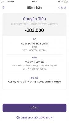 Loannguyen đã chuyển 282,0000đ CMTX tháng 02/2022 (ghi nhầm tháng 1) từ CLB Hy Vọng đến chị Hà, nhờ nhóm chuyển giúp đến cụ Hinh nhé.