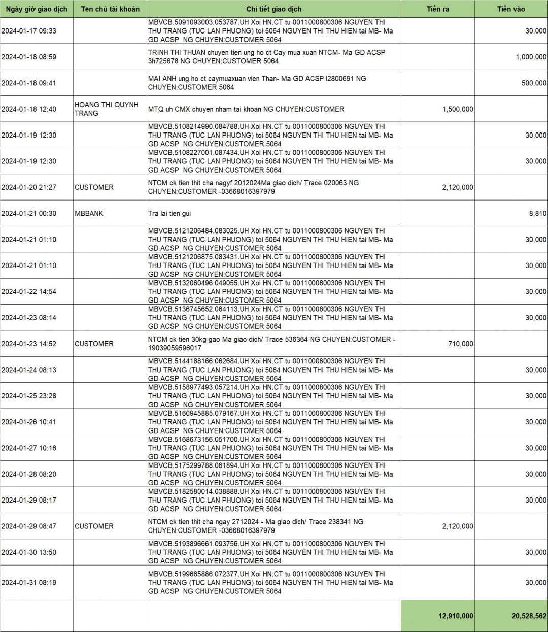 -Tháng 1: Tổng thu: 20.528.562 vnđ; Tổng chi: 12.910.000 đ