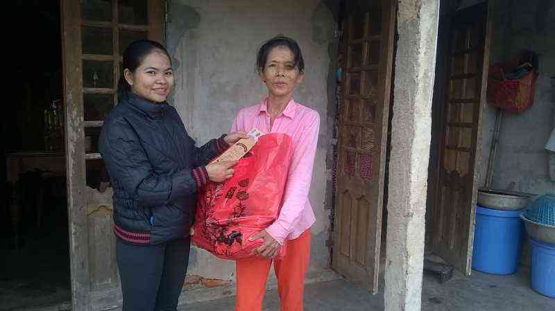Hoàn cảnh: O Cam năm nay 54 tuổi, chồng chết do bom đạn, có 1 đứa con gái đã lập gia đình nhưng đã li dị chồng, giờ nuôi 2 con nhỏ (1 bé 5 tuổi bị khuyết tật hộp sọ, 1 bé 3 tuổi). nhà thuộc diện hộ nghèo
