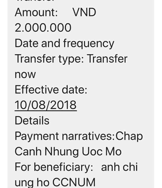 @Thocon : Em chuyển tới Mongthuynavy 20,000,000đ để các bạn khu vực Nghệ An chuẩn bị hàng hóa cho chương trình Chắp cánh những ước mơ 2018 dùm nhé.