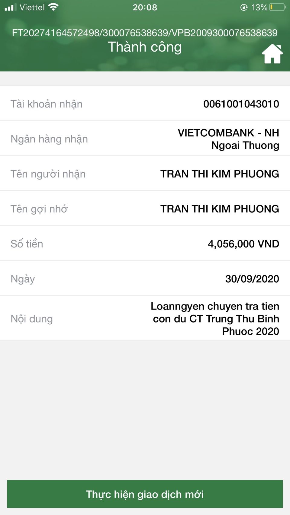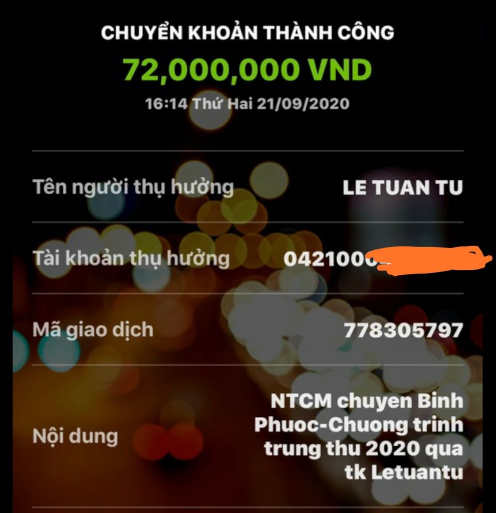 Ngày 21/09/2020, Loanngyen nhận từ Letuantu 72,000,000đ để chi cho chương trình, chi phí thực tế 67,944,000đ. Như vậy còn dư 4,056,000đ, Loannguyen đã chuyển khoản trả lại Quỹ rồi ạ.