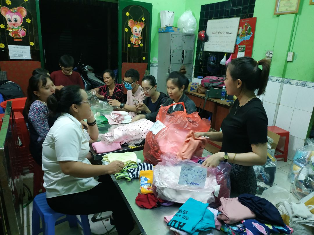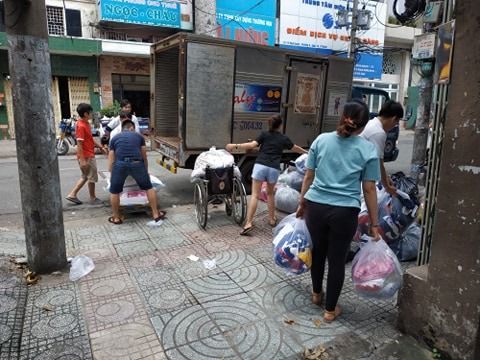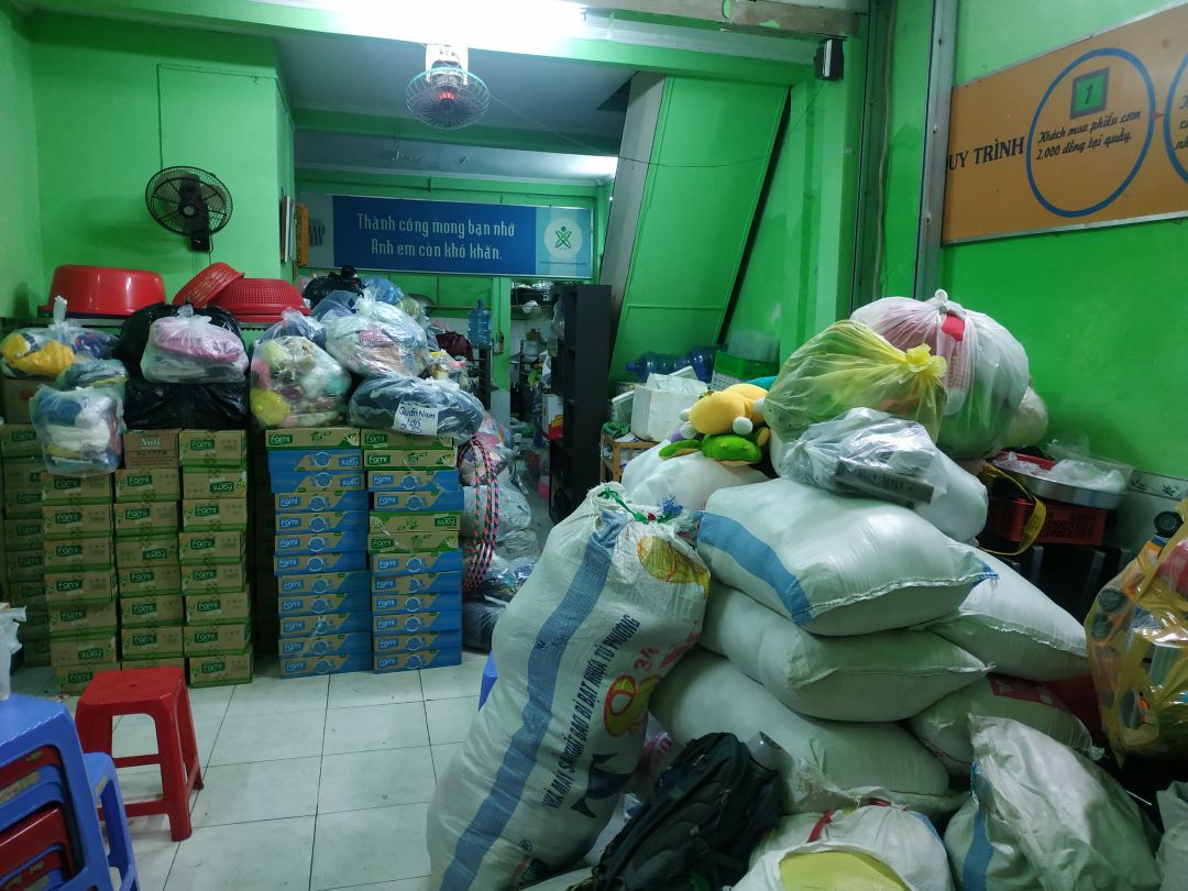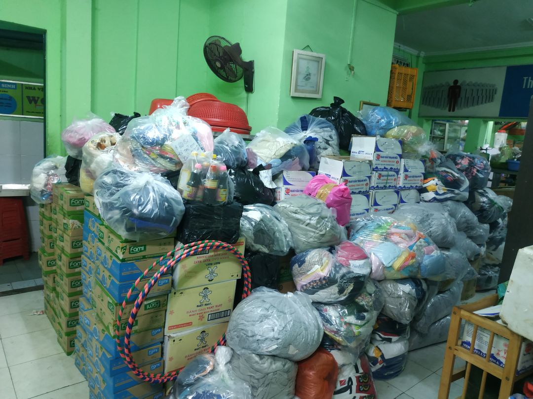 Hôm trước mẹ Bạn Mỹ Sương Bùi (có xưởng may ở Đồng Tháp) có tặng cho chương trình khoảng 1,000, chiêc áo quần mới cho bà con và các cháu và 147 cái chăn, nhưng do may chăn không kịp nên chỉ tặng 1,300 cái áo quần mới thôi ạ. Xin cảm ơn tấm lòng của cô rất nhiều. Sáng nay cô kêu xe tải nhỏ chuyển số lượng quần áo này lên quán cơm 2000đ SG.