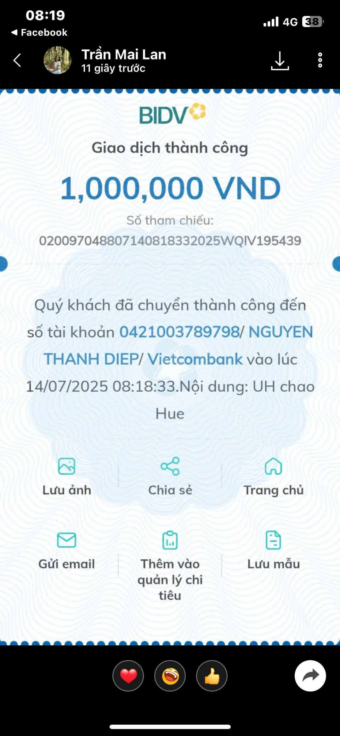 Nhờ TĐP duyệt chuyển tiền hỗ trợ nồi cháo Huế để hoạt động nồi cháo không bị gián đoạn !