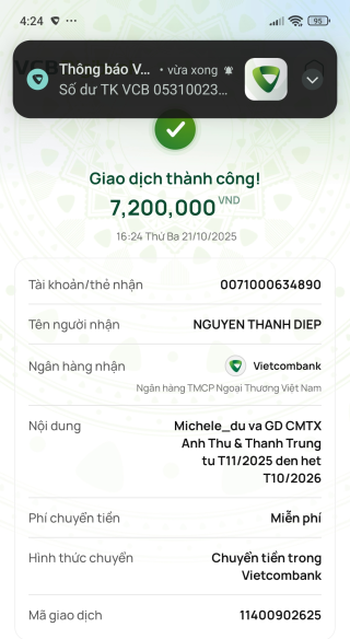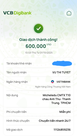 Michele_du và Gia đình đã chuyển tiền CMTX các cháu 1 năm.
