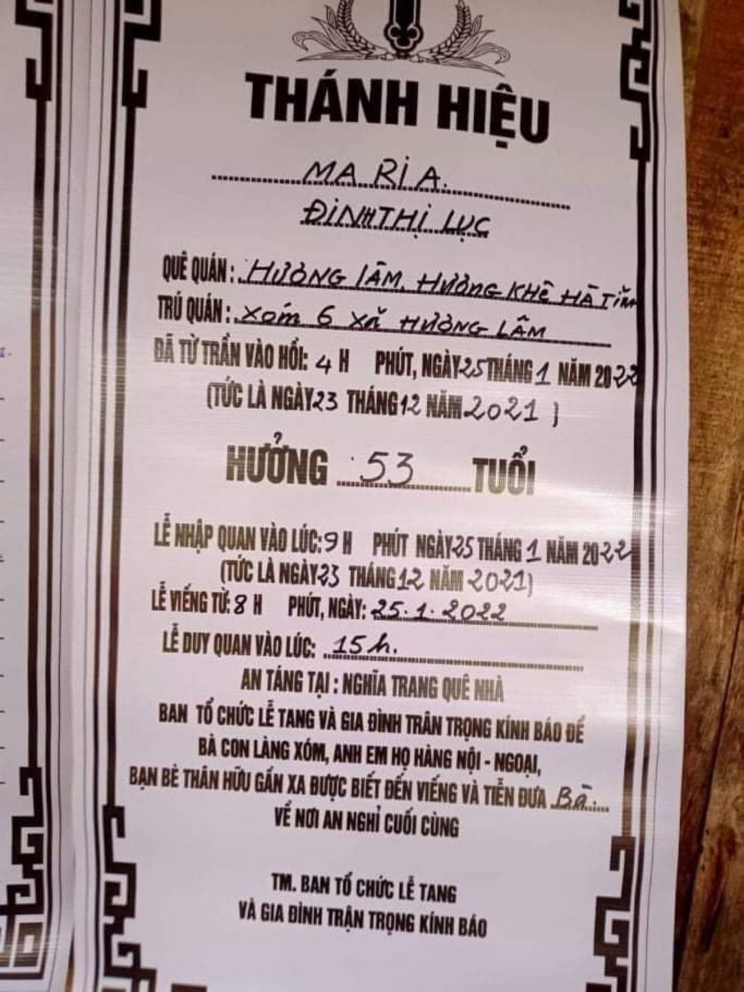 Trưa nay VKS mới nhận được ctrinh tang lễ của các bạn TNV trên đó, vì điều kiện gđ nên các đoàn thể thống nhất đưa chi đi trong ngày 25/01/2022