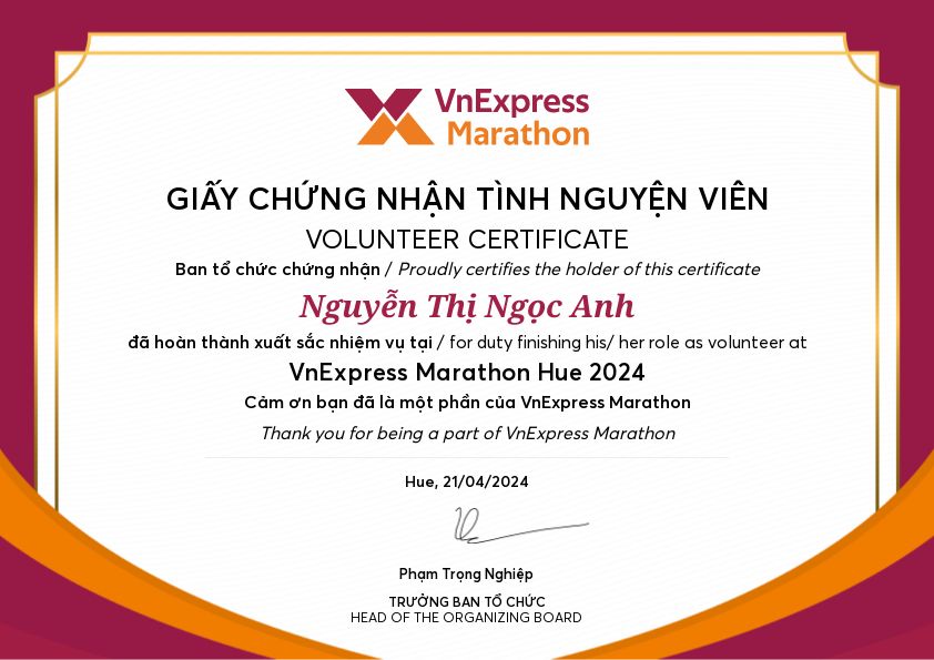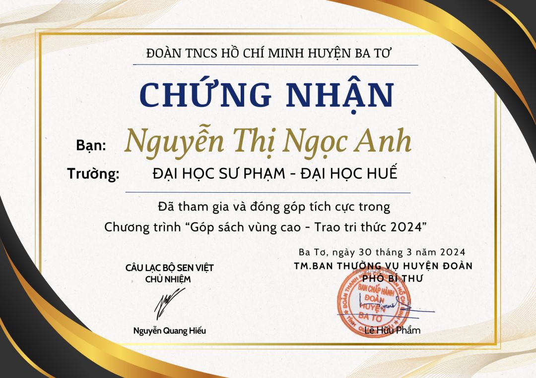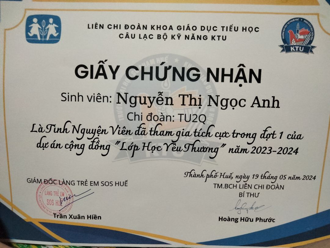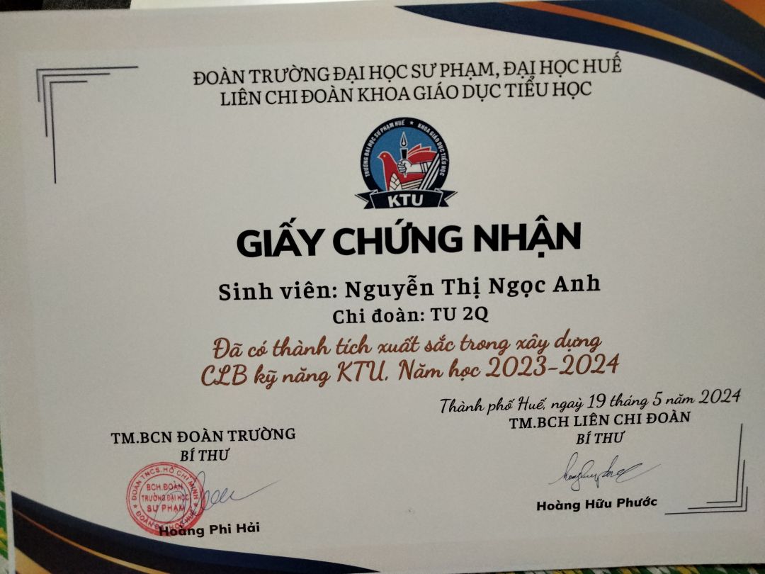 Bây giờ, con đã bắt đầu năm học mới và đã là sinh viên năm 3 khoa GDTH, Trường ĐH Sư phạm, Đại học Huế. Hiện tại con vẫn làm dạy kèm gia sư với thu nhập khoảng 1 triệu/ 1 tháng. Trong suốt thời gian hè 2 tháng vừa qua con cũng tham gia nhiều hoạt động ý nghĩa như tiếp sức mùa thi, hỗ trợ thí sinh thi năng khiếu và hoạt động tình nguyện hè, tham gia giải chạy, hiến máu... Đạt giải Khuyến khích Cuộc thi "Đại sứ văn hoá đọc toàn trường". Các hoạt động này và nhiều thành tích Đoàn - Hội của con đều có giấy khen nhưng con chưa kịp nhận để cập nhật ạ! Khi có con sẽ cập nhật sớm nhất.