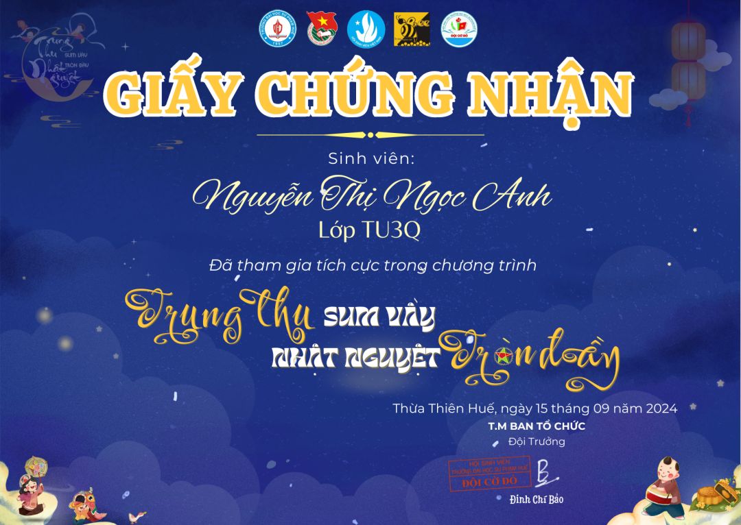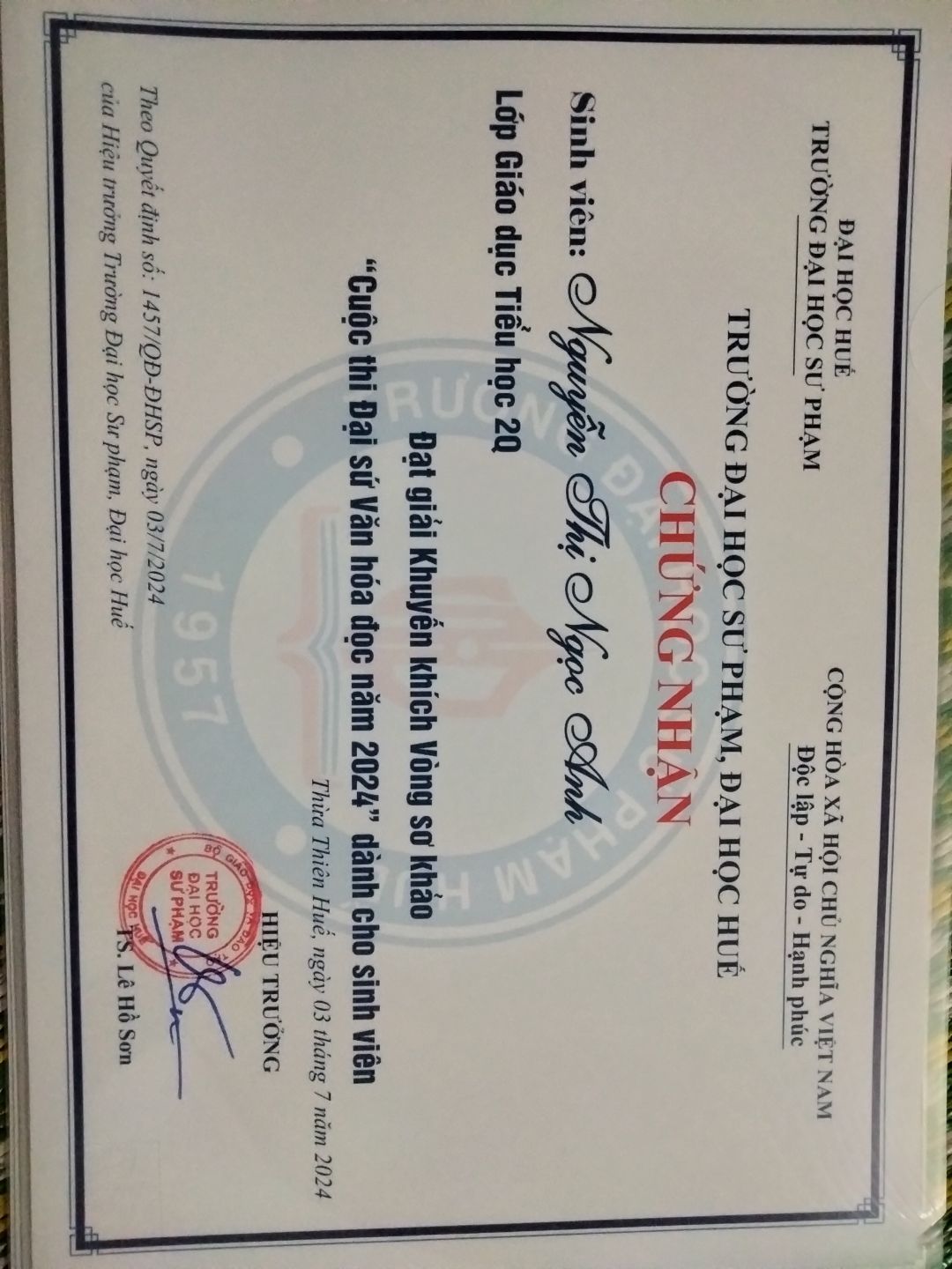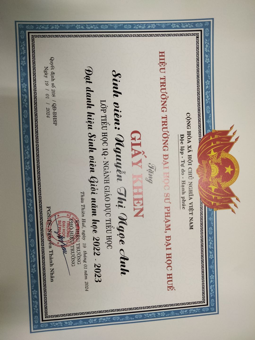 Tình hình học tập và rèn luyện thời gian qua của con vẫn tốt ạ! Với sự nỗ lực năm học vừa qua thì con vừa đạt được danh hiệu Sinh viên 5 tốt cấp trường và cấp Đại học Huế.