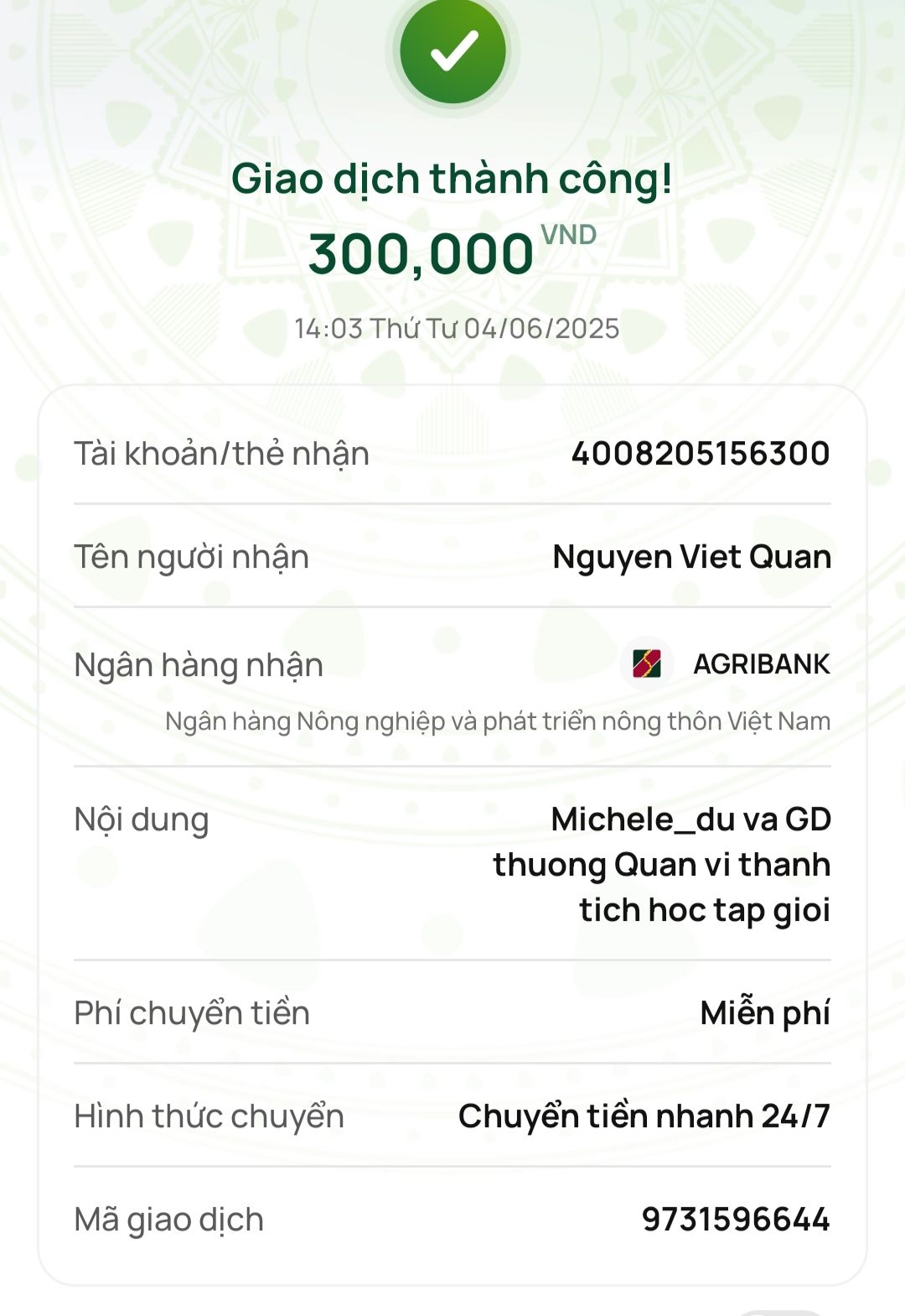 Michele_du và Gia đình thưởng cho em Quân 300,000₫ vì thành tích học tập xuất sắc nhé.