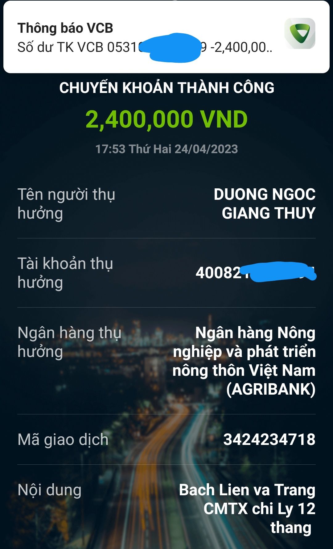 "Agribank: 17h53p 24/04 TK +2,400,000VND (876308-MBVCB.3424234718.003906.Bach Lien va Trang CMTX chi Ly 12 thang .CT tu 0...).. mỗi tháng 200.000 đ