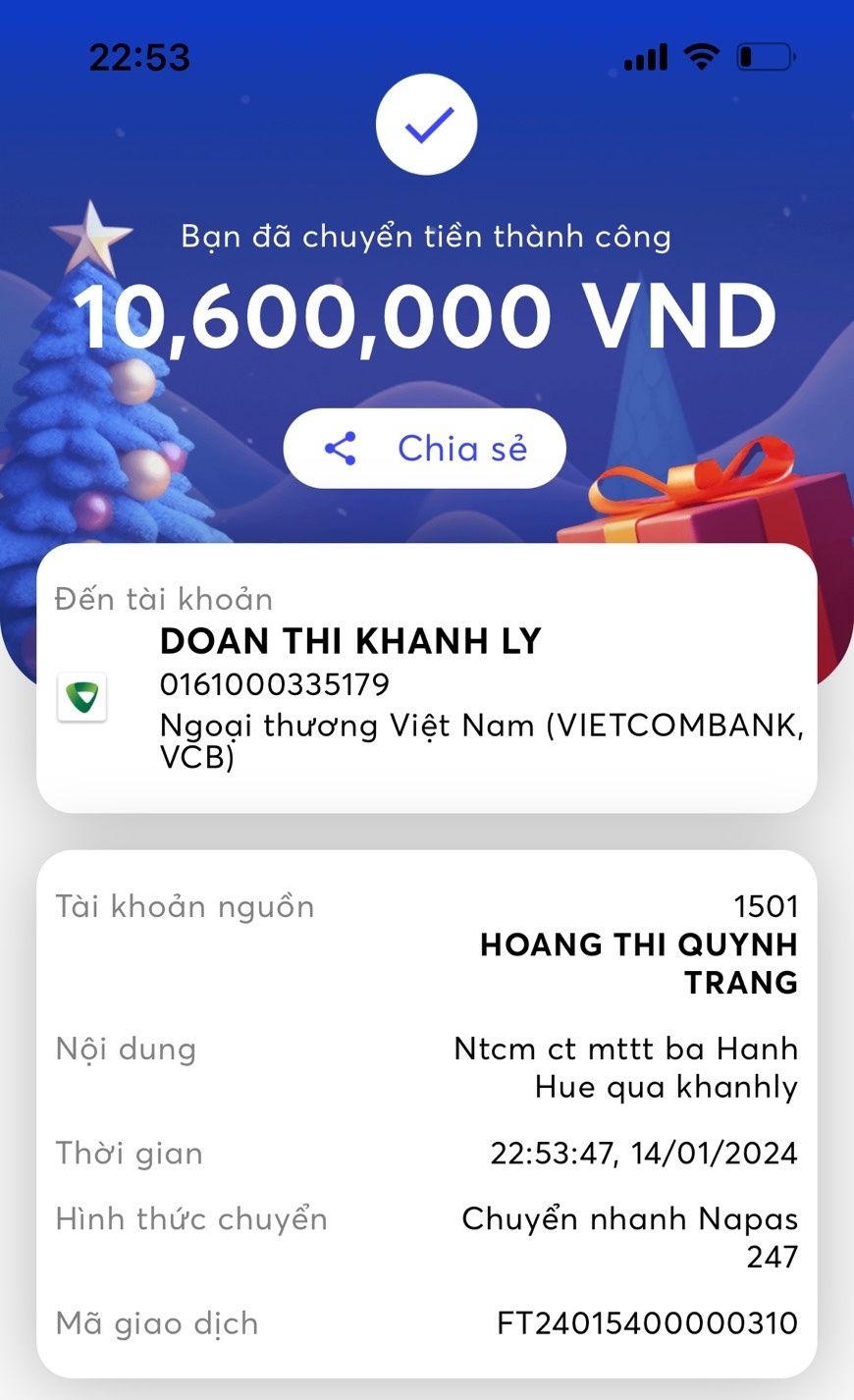 KLy đã chuyển 10.600.000 vnd đến gia đình bà.