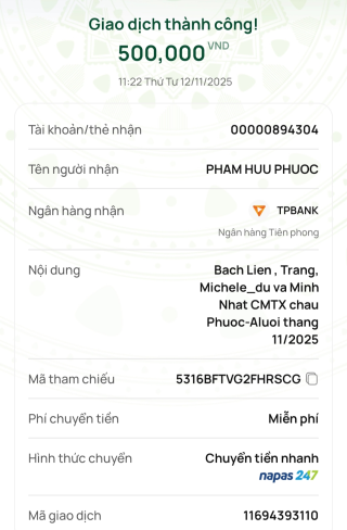 Bạch Liên, Trang, Michele_du và Gia đình cùng Minh Nhật gửi 500,000₫ tiền CMTX cháu @Phuocpham tháng 12/2025.