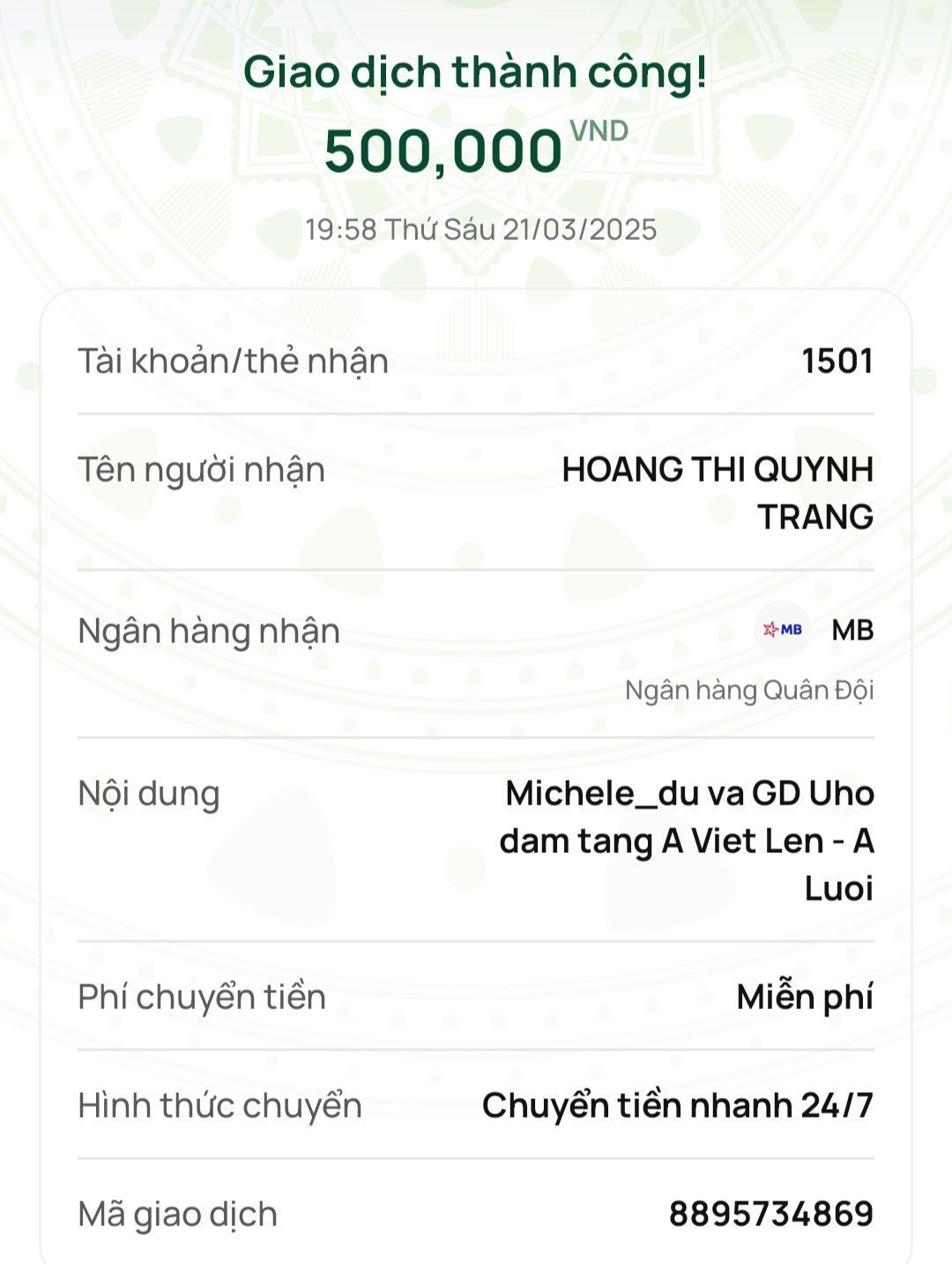 Michele_du và Gia đình ủng hộ đám tang của anh Lên 500,000₫.