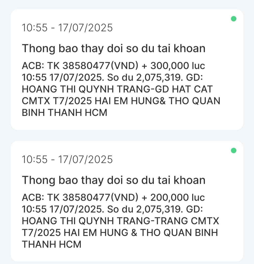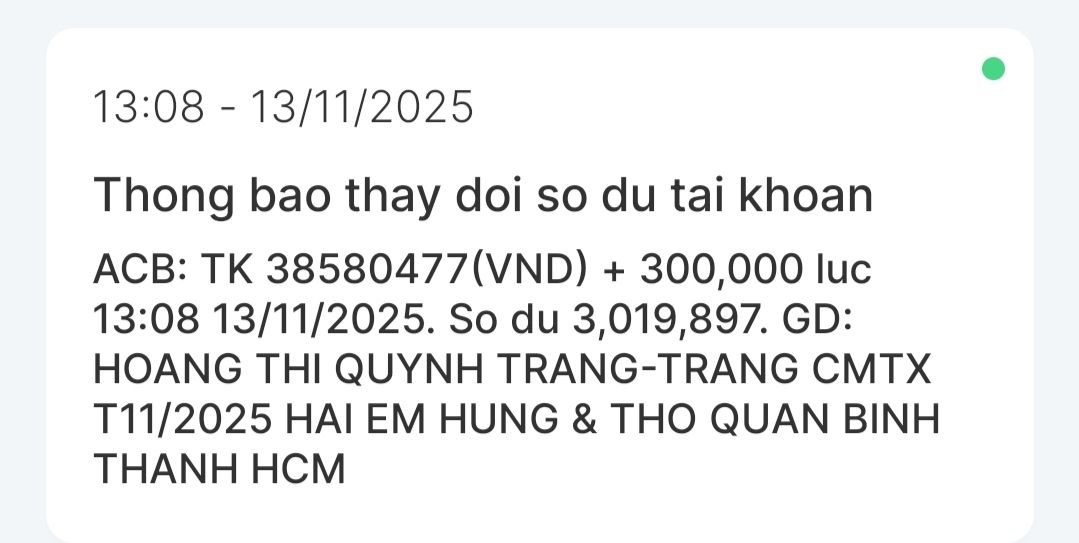 Dạ con xin chào cả nhà ạ. Con là Nguyễn Hữu Thọ con đã nhận được CMTX T5, CMTX T6, CMTX T7, CMTX T8 và nhu yếu phẩm con xin cảm ơn GD HAT CAT, cô Trang và quán cơm 2.000₫ đã hỗ trợ anh em con. Dạ trong tháng 6,7 vừa qua thì con cũng vừa thi xong và cũng có kết quả dù cố gắng nhưng điểm không như con mong muốn nhưng con cũng không nản chí con cũng tận dụng đà học thì con cũng học thêm nhiều thứ như học thêm tiếng anh hay con tìm hiểu và học thêm về ngành khoa học dữ liệu con đang theo đuổi. Thời gian qua thì con cũng có đi làm quán cà phê con làm cũng khá ổn và học thêm nhiều kĩ năng như giao tiếp với khách với chủ hay với các bạn làm chung con cũng có học hỏi được cách làm matcha latte ạ hihi. Mà do ông ngoại lớn tuổi, hay quên với nhà không có ai đưa đón bà ngoại đi làm, coi chừng nhà nên con nghỉ để ở nhà phụ giúp và học ạ. Con có tranh thủ thi chứng chỉ MOS PowerPoint và con cũng đậu được đại học nhưng còn thiếu học phí và nhờ có chương trình Heartbank đầu tư cho tương lai và mọi người hỗ trợ nên con có thể tiếp tục giấc mơ đại học. Con xin cảm ơn cả nhà rất nhiều ạ.