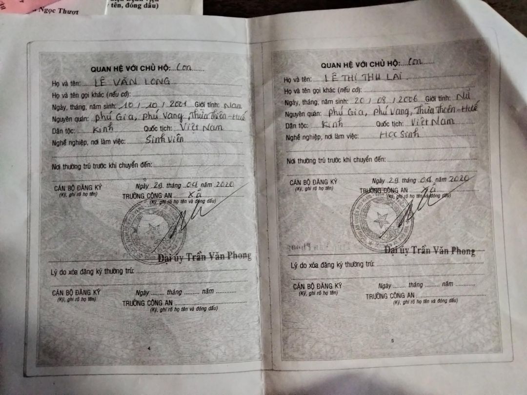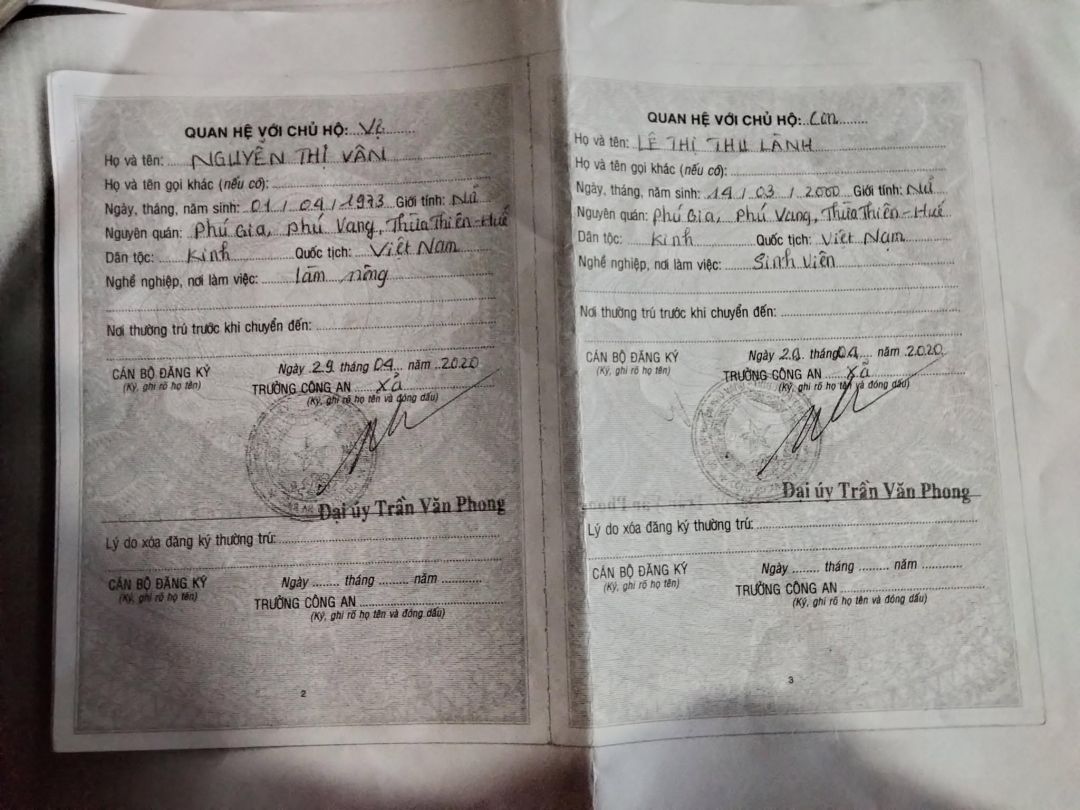 Địa chỉ thường trú thôn Diêm Tụ,Xã Phú Gia, Huyện Phú Vang, tỉnh Thừa Thiên Huế.