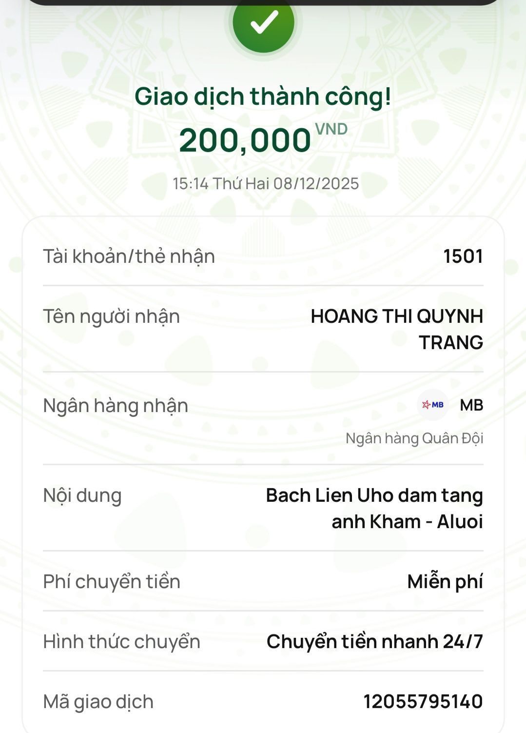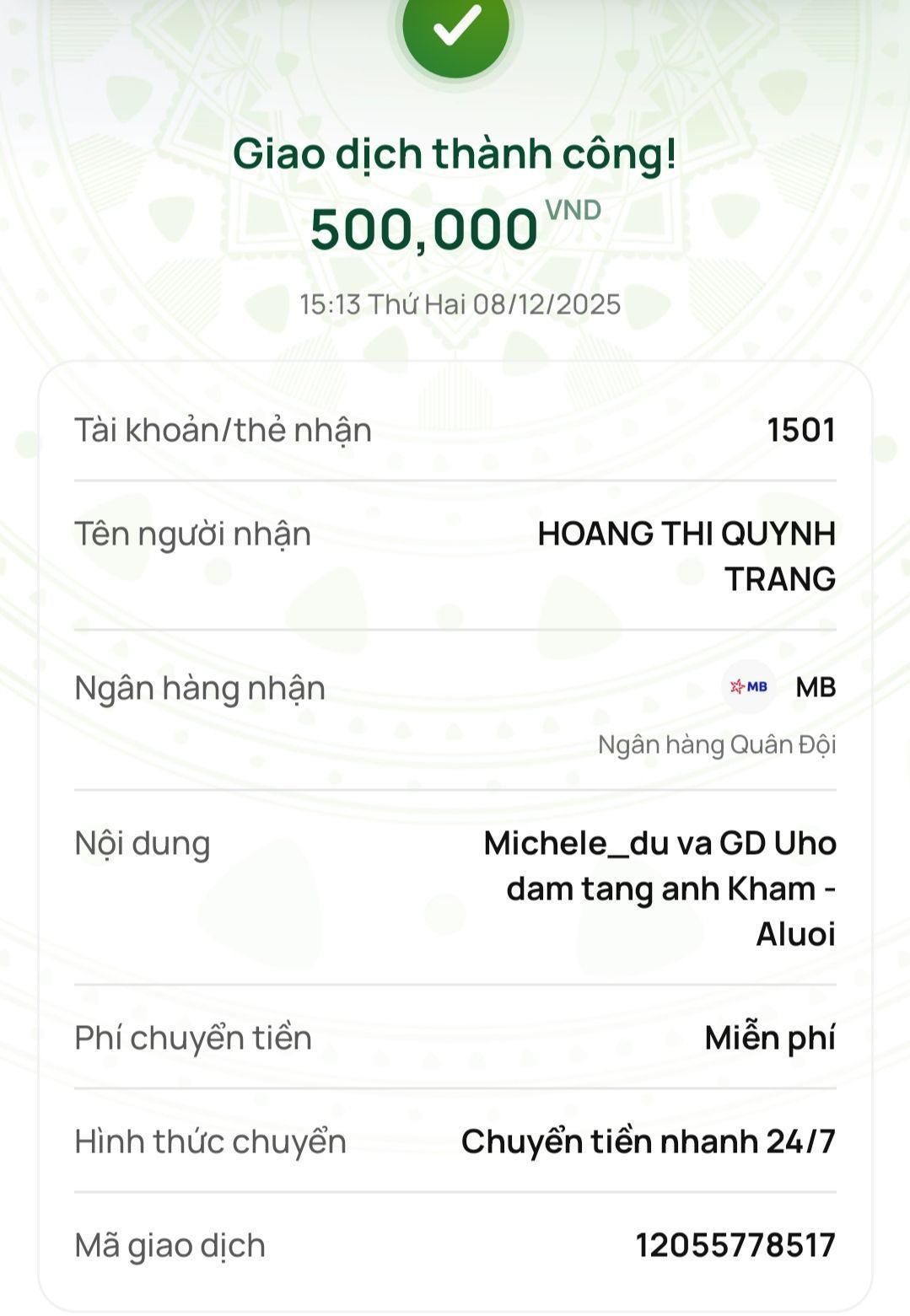 Trường hợp này sau khi chuyển tiền chị Wendy Duong thì Quỹ nhận được thêm hỗ trợ của MTQ ẩn danh nên còn dư 650.000đ, nhờ tổ điều phối chuyển khoản này đến gia đình tiếp ah. Thanks anh 6x.