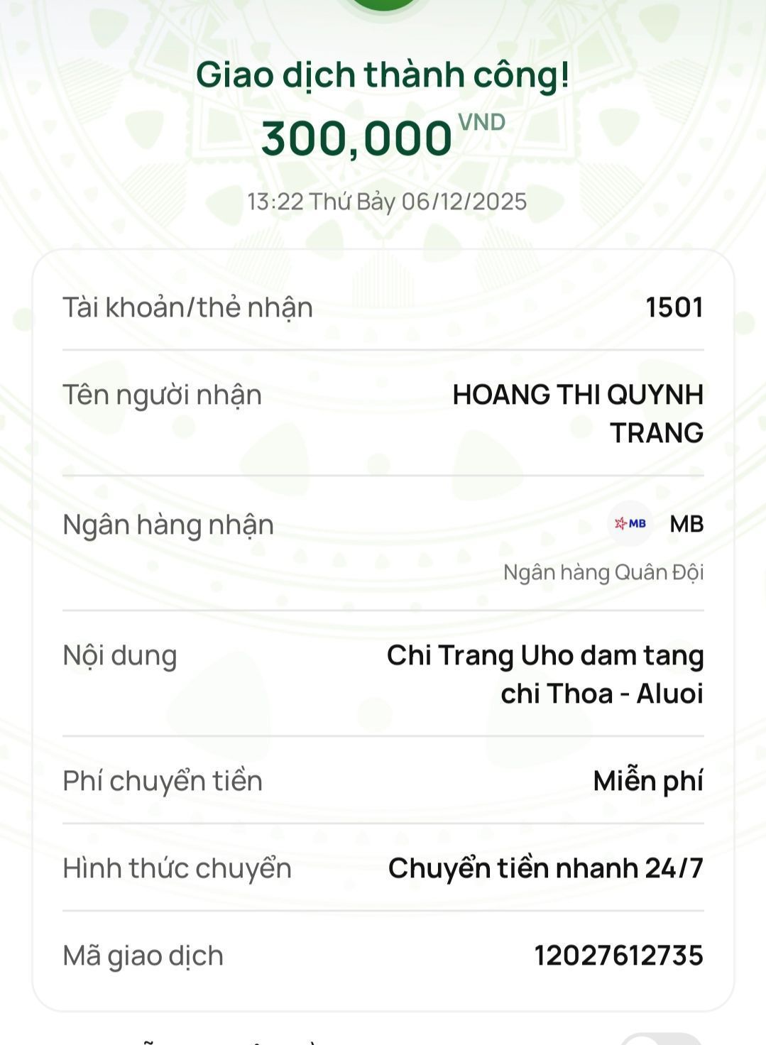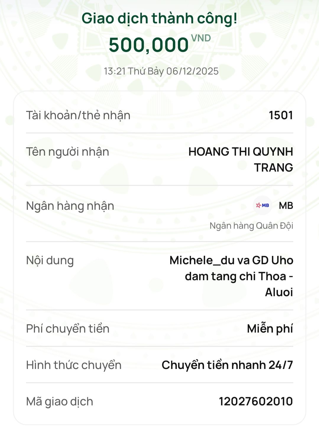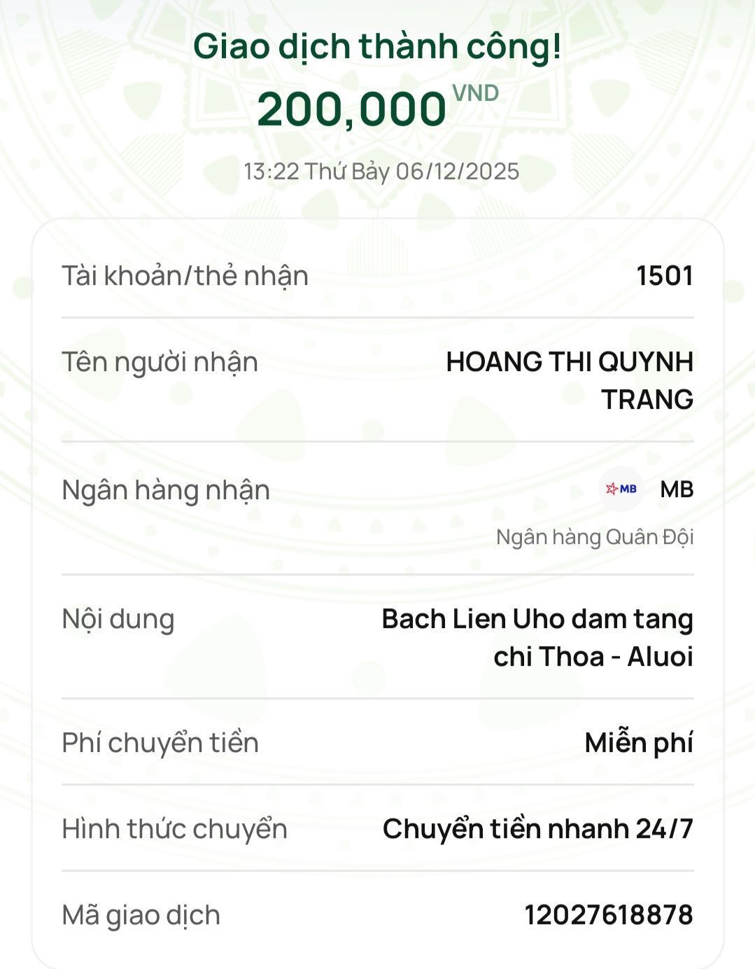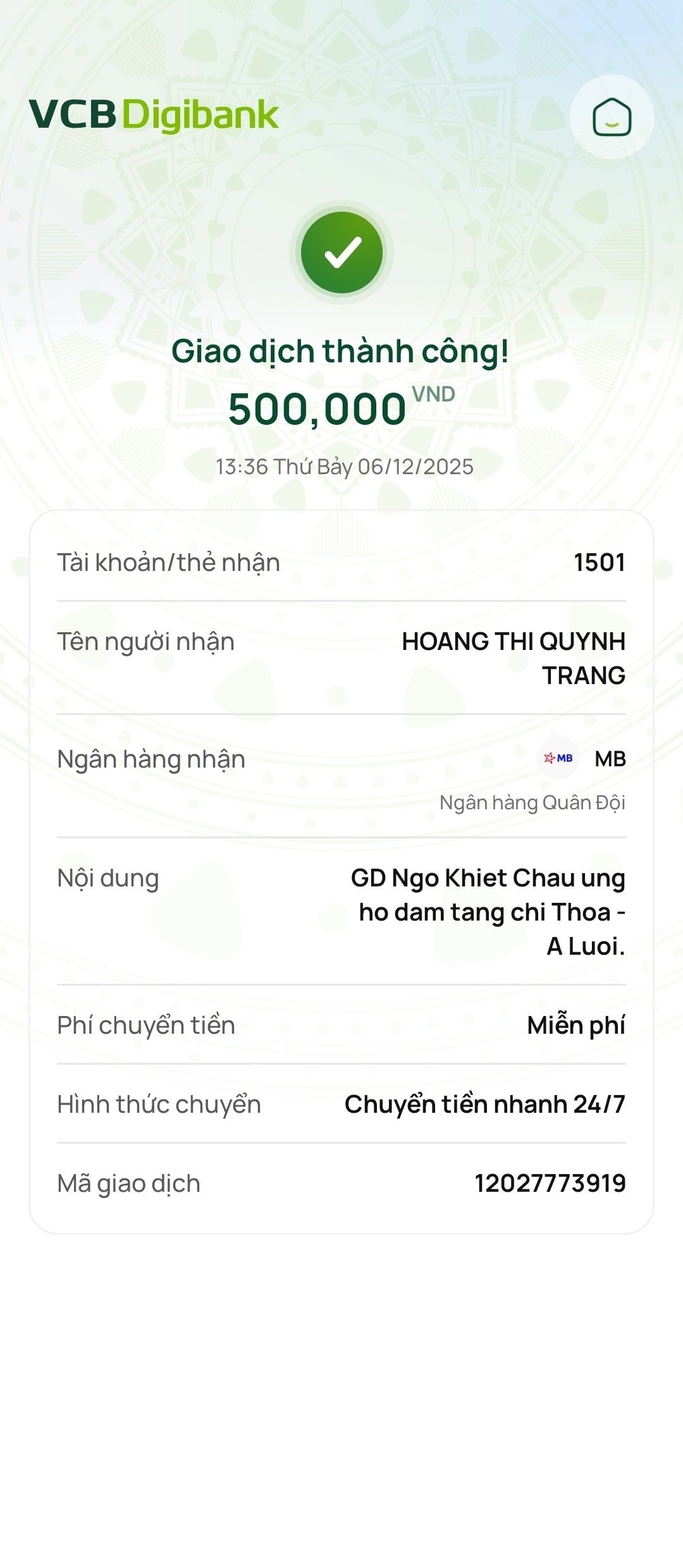 Thay mặt gia đình xin cảm ơn ban quản trị, ban điều phối và quý MTQ đã hỗ trợ và giúp đỡ gia đình kịp thời ạ!