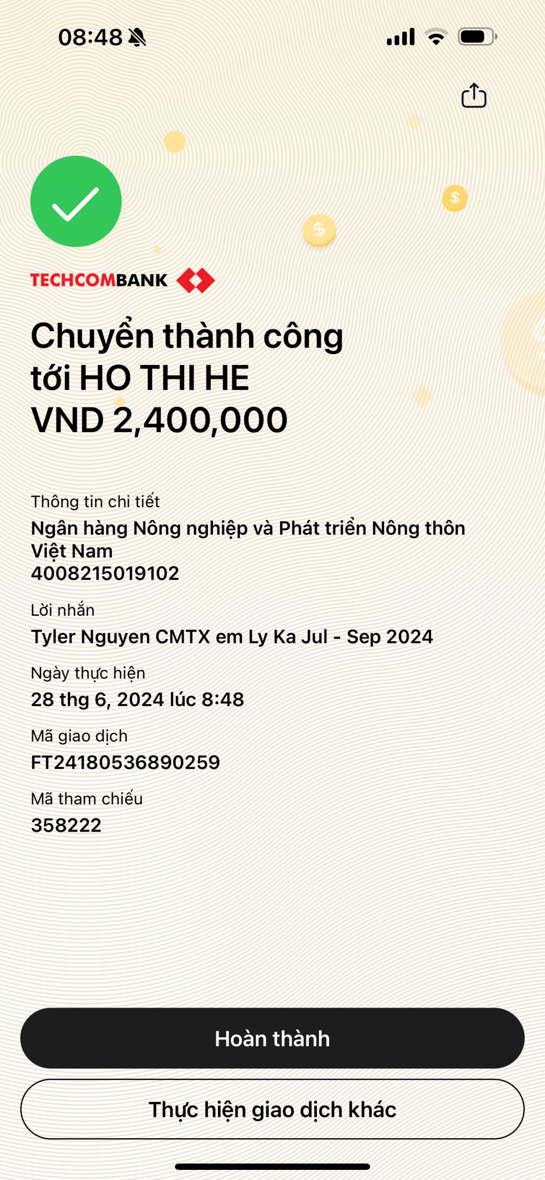 Kỳ này Chú Tyler Nguyen chuyển tiền CMTX cả quý 3/2024 (7-9/2024). Mong mẹ He thu xếp rút tiền từng tháng để lo cho bé nhé!