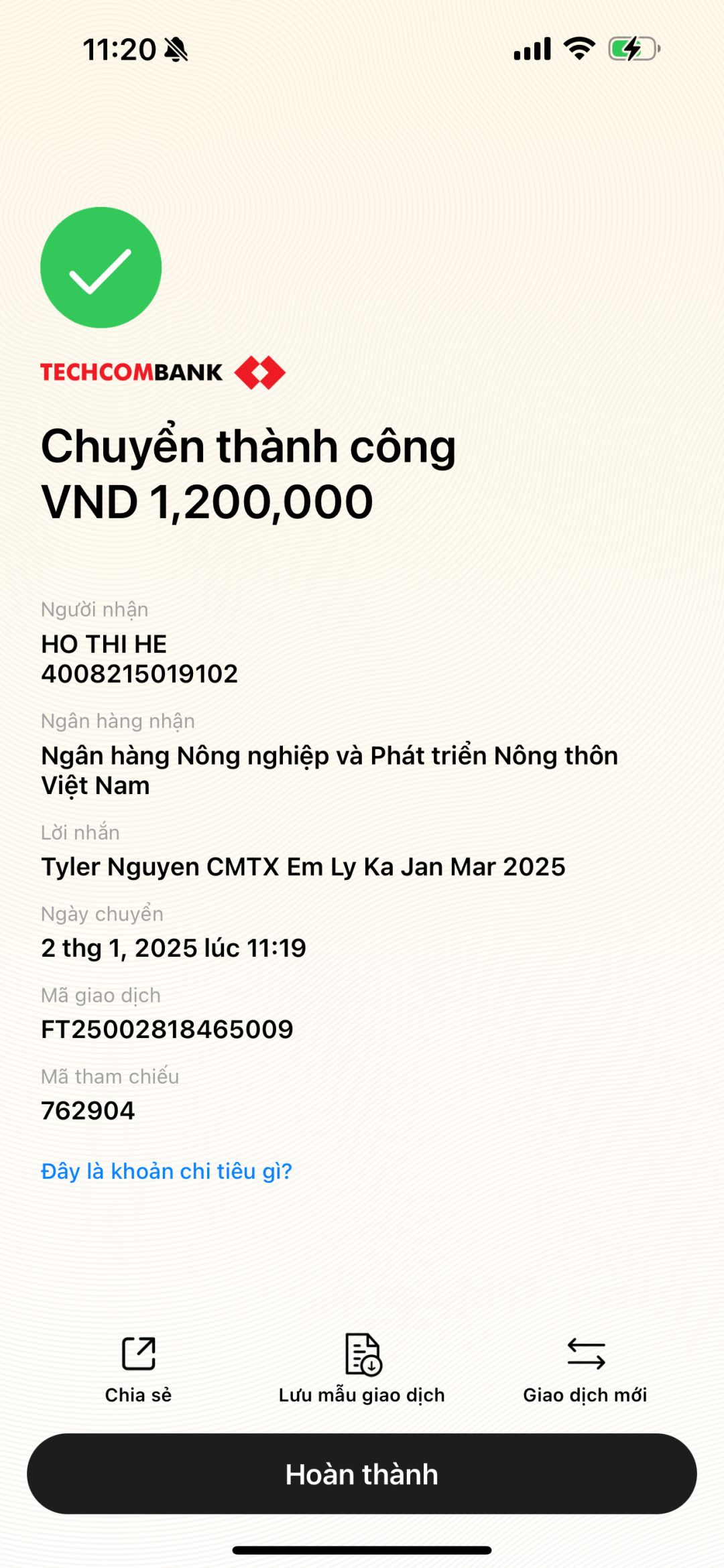 Em chào các mạnh thường quân em là Hồ Thị Hè em đã nhận được tiền CMTX quý I tháng 01/02/03/2026 là 1.200.000 nghìn đồng. Em cảm ơn anh Tyler Nguyễn rất nhiều ạ.