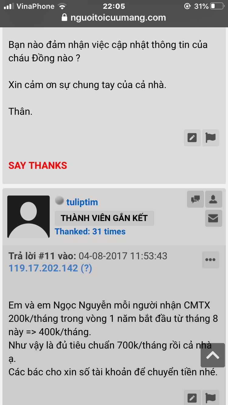 Tuena trung chuyển tiền và cập nhật thông tin về cháu Đồng các bạn nhé.