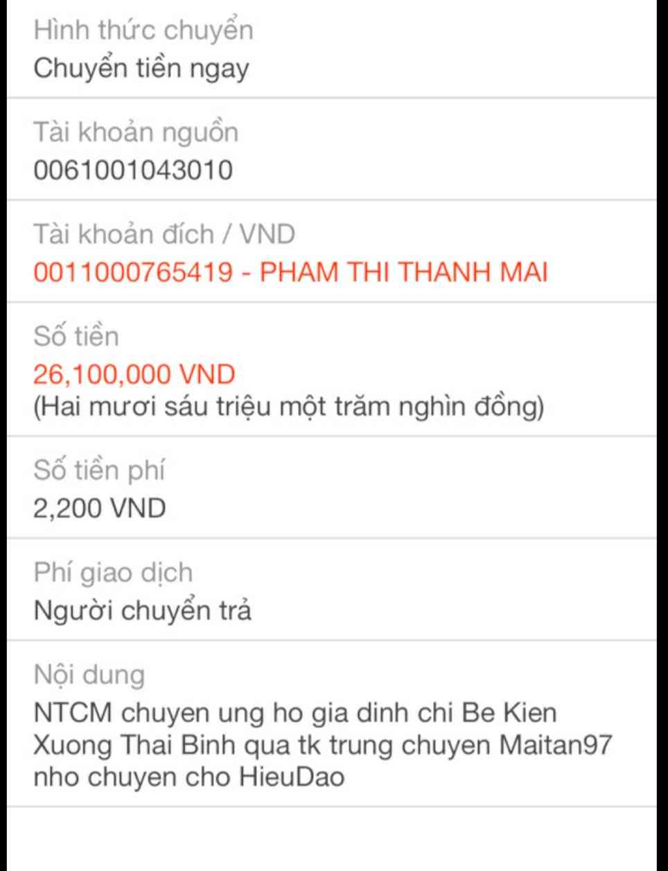 Báo cáo với anh chị em ngày 16/11/2019 Em Hiệu Đào đã chuyển số tiền là 26.400.000 đến tay bà Bé và anh Hà. có sự chứng kiến của Chính quyền địa phương và phòng công tác xã hội của bệnh viện Đa Khoa Tỉnh Thái Bình ạ.