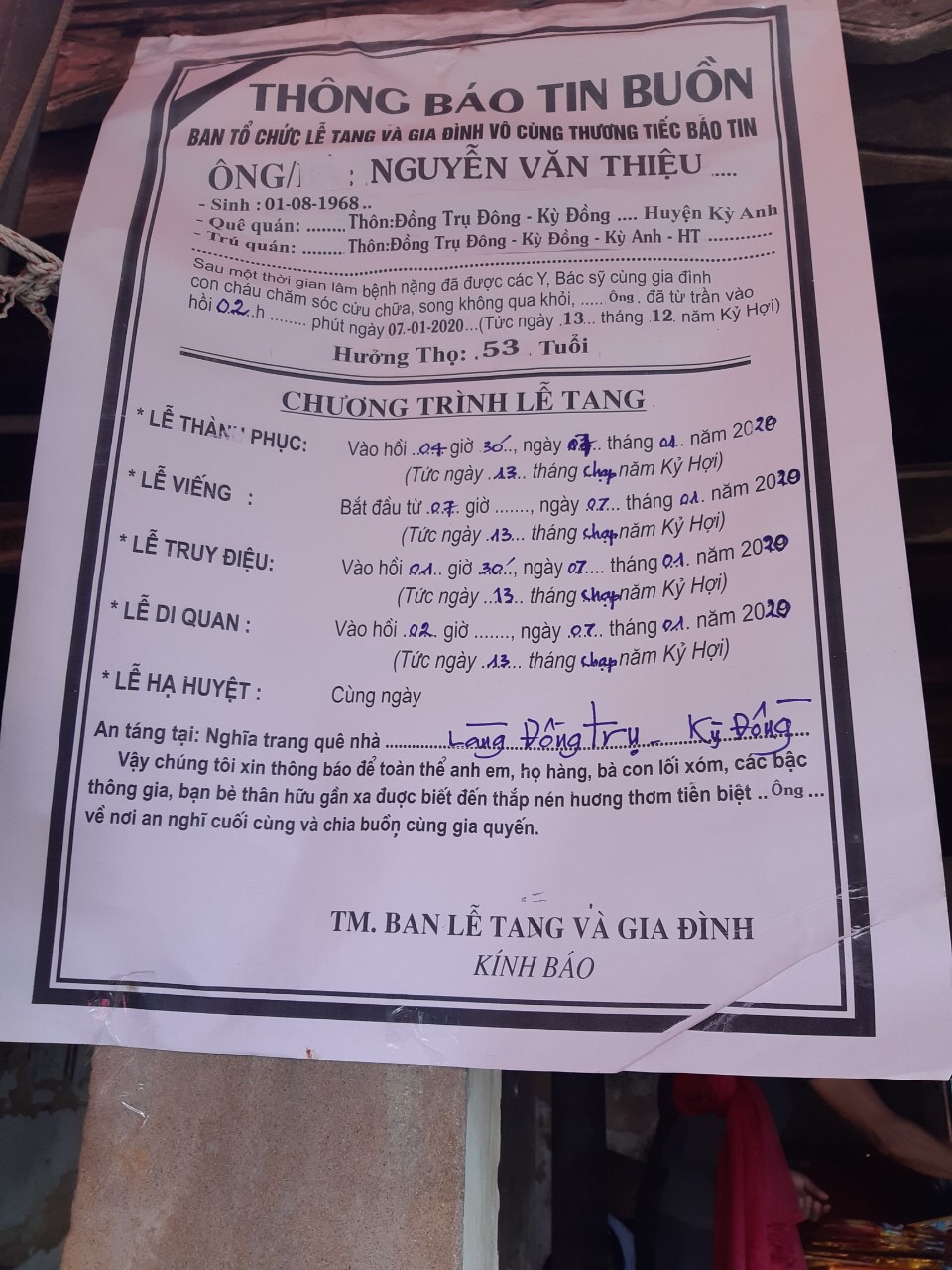 Tác giả Chủ đề: Hà Tĩnh (Kỳ Anh) - Anh Thiệu - Cần hỗ trợ mai táng  (Đã xem 3037 lần)