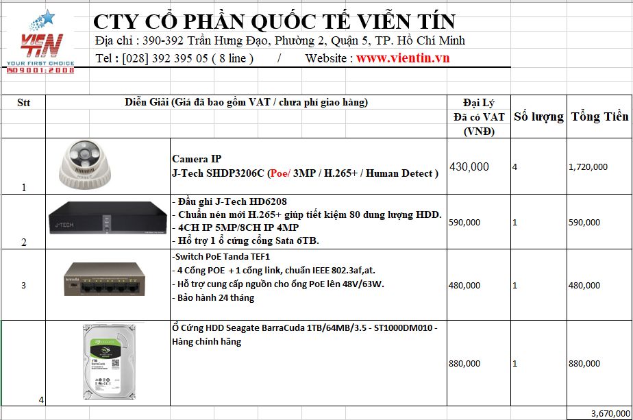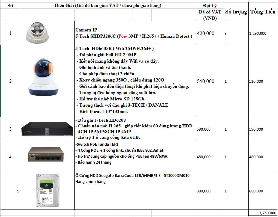 @letuantu  ơi DucTai lấy báo giá từ công ty Viễn Tín ( https://vientin.vn/camera-j-tech.html). Tú liên hệ với họ xem có được giá tốt hơn không nhưng theo giá DucTai lấy thì là giá rẻ nhất bên đó bán cho Đại lý rồi, nhưng cũng nên thử.