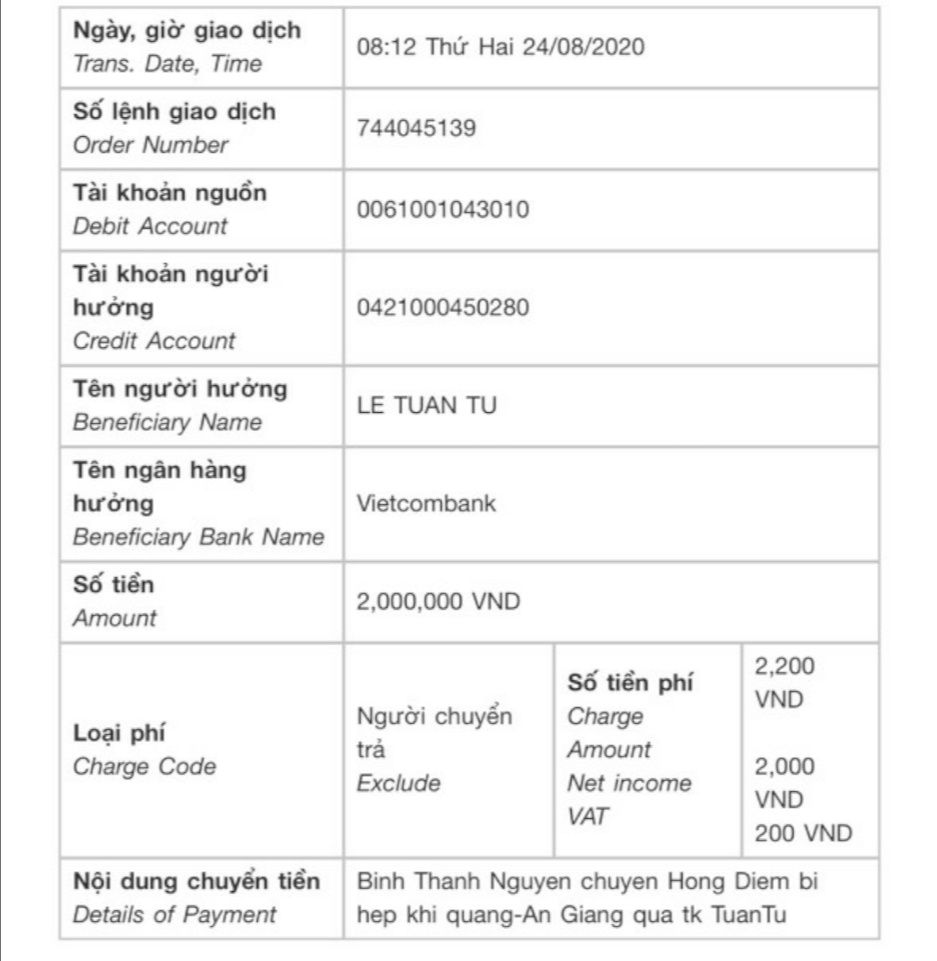 Ngày 27/8, letuantu đã trao 2,000,000đ tiền CMKTX cho chị Hồng Diễm do anh @Bình Thanh Nguyễn hỗ trợ.