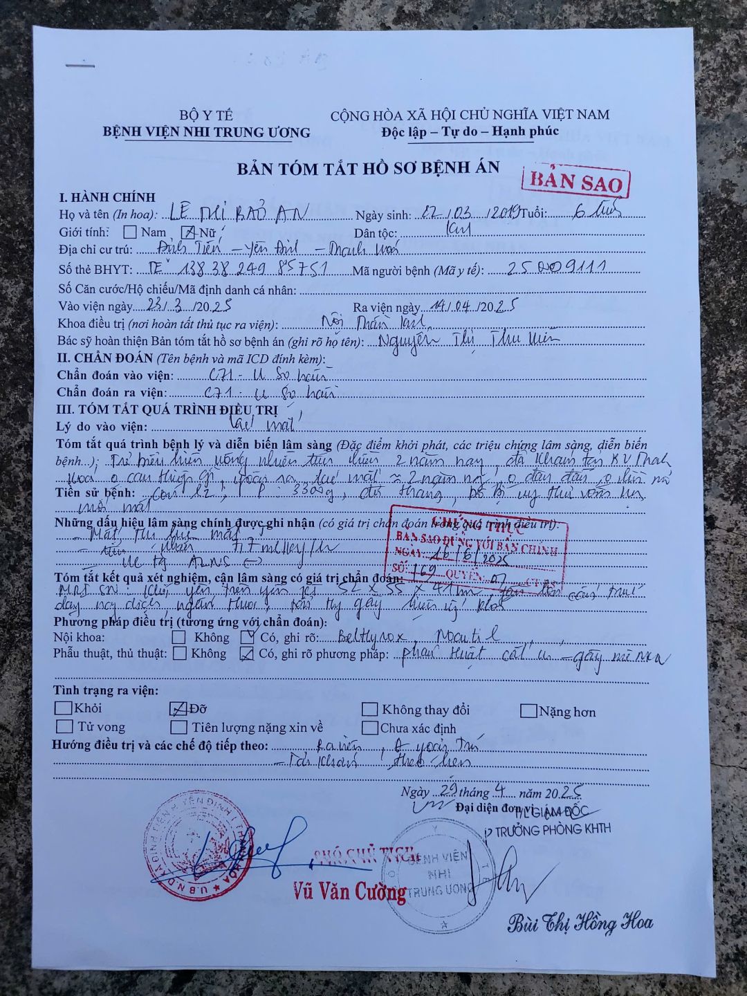 Xin lỗi cả nhà vì sự chậm trễ trong việc cập nhật. Sáng nay Viết Tơ- Mai Hương- Ninh Dũng- Hoa Xương Rồng đã lên trao quà cho trường hợp bé Bảo An. Bé mới từ viện về tuần trước. Khối U não phẫu thuật 1 lần rồi nhưng khối U vẫn phát triển và đag có lịch mổ sau tết âm lich. Hiện 1 mắt cháu đã bị hỏng, mắt còn lại giảm 1/2 thị lực. Hiện tại mẹ cháu đã nghỉ việc, nhà còn bà cố nội, bà nội và chị gái cháu đag đi học. Hoàn cảnh gia đình rất khó khăn. Sắp tới cuộc sống của cả nhà không biết sẽ ra sao. Mong sự chung tay của cả nhà!Đề xuất của nhóm trước mắt cho gia đình bé Bảo An là :1triệu đồng/tháng.