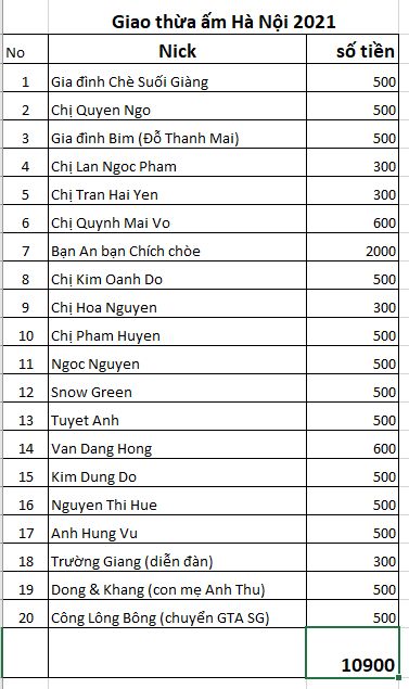Em xin cập nhật danh sách ủng hộ chương trình GTA HN 2021 ạ:
