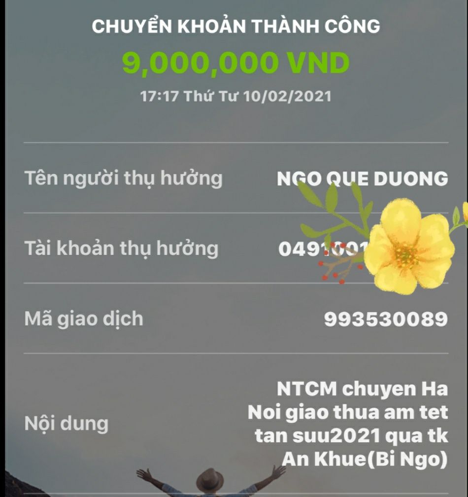 @Thocon : Em chuyển tới An Khuê 9,000,000đ để các bạn khu vực Hà Nội thực hiện chương trình dùm nhé.