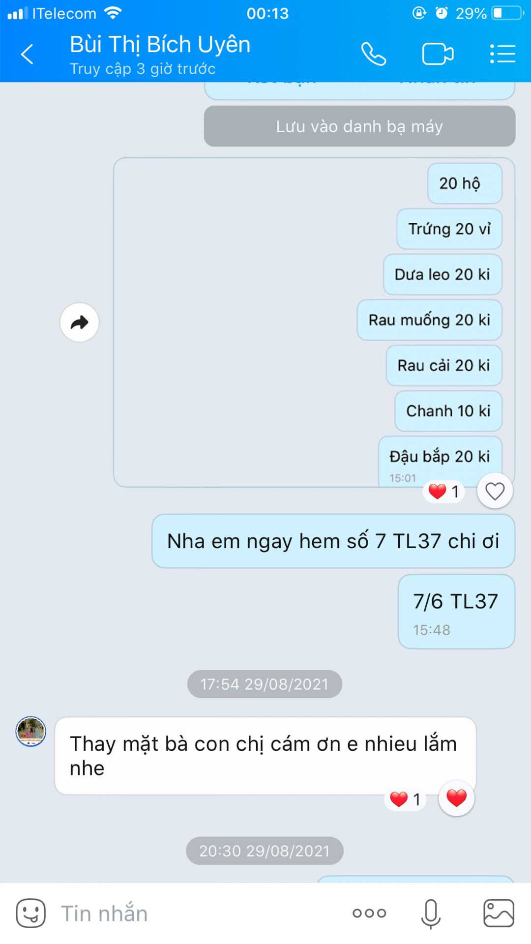 Hôm nay 29/8, bếp đã nhận được rau(cải ngọt, rau muống, đậu bắp, dưa leo mỗi loại 20 kí), chanh 10 kí và trứng 20 vỉ, 10 cái/vỉ. Sau khi nhận đã bàn giao cho chị Uyên tổ trưởng tổ 7, kp1 và đại diện xóm trọ (chị Đỗ Thị Nguyệt/sđt: 0839736164). Vì đi lại khó khăn và tiếp xúc hạn chế nên không kịp chụp hình a.