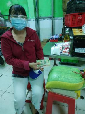 Hôm nay, chị Nga - mẹ em Minh đã đến quán cơm để nhận gạo, nhu yếu phẩm và 300,000đ tiền CMTX T12 do chị Thaohang hỗ trợ.