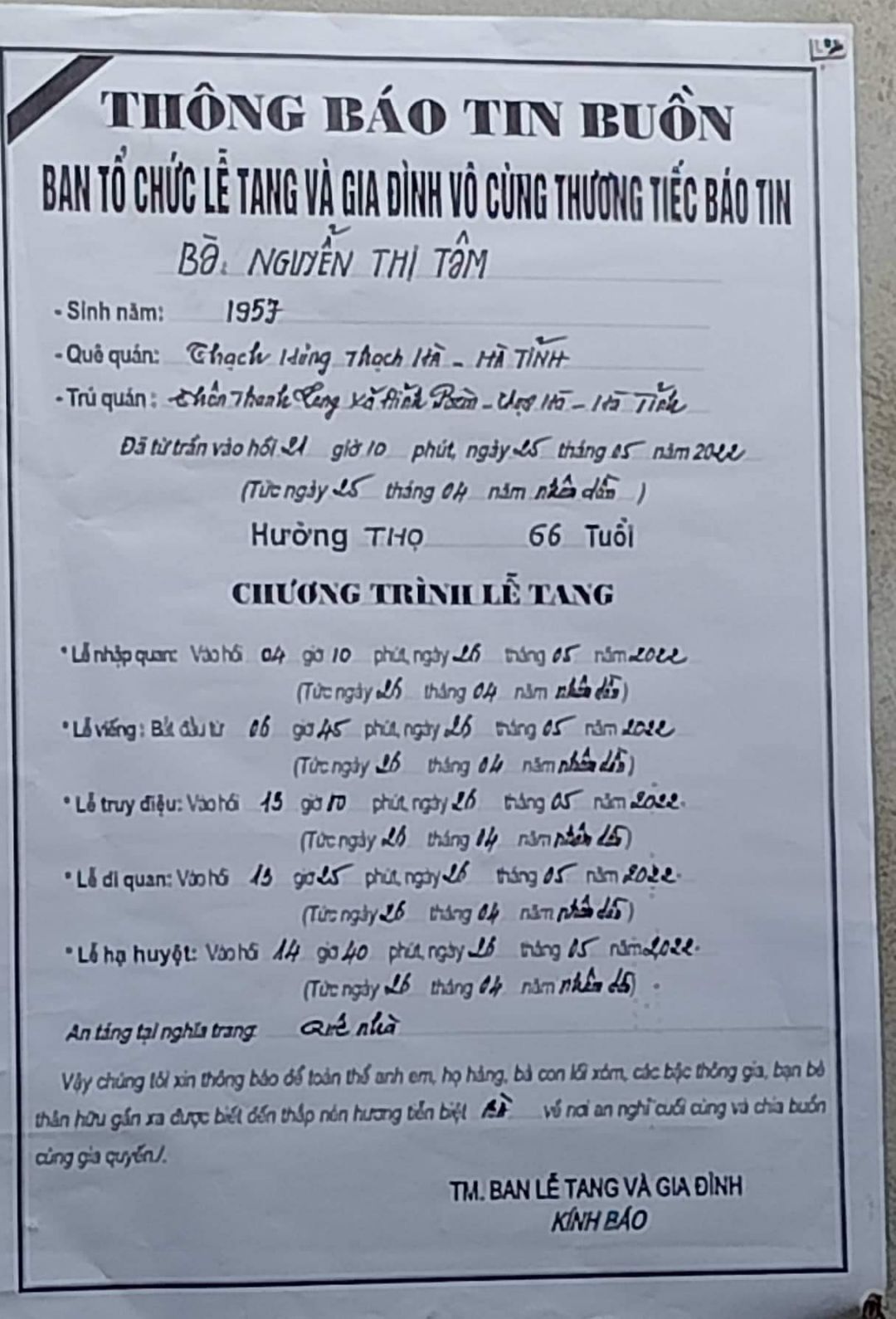 Bà Phạm Thị Tâm- sinh năm 1957( hưởng thọ 66 tuổi)