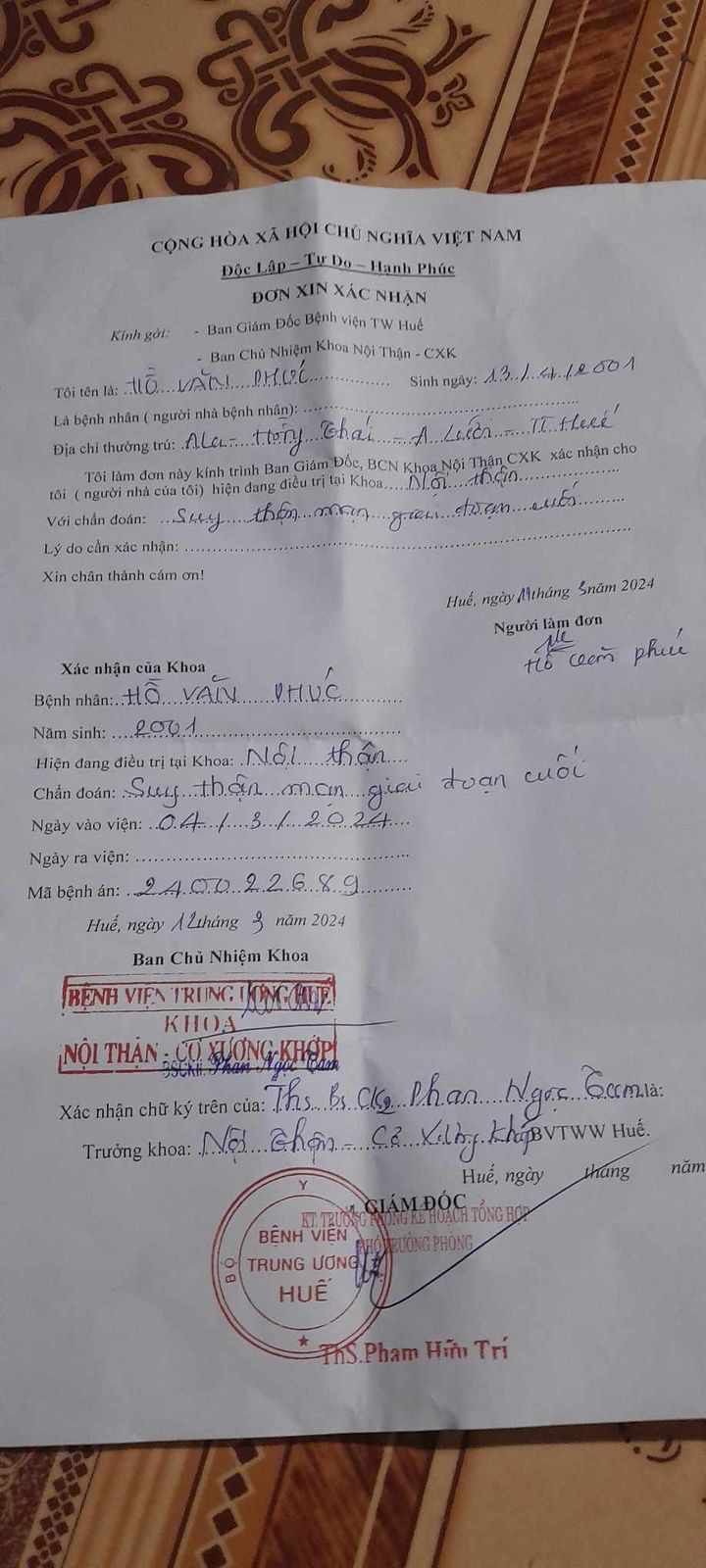 Em tên là Nguyễn Thị Nìn. Em xin giới thiệu hoàn cảnh em Hồ Văn Phúc , sinh năm 2001 và vợ em tên Hồ thị Lăm sinh 1999 sống tại Thôn A La, xã Hồng Thái, huyện A Lưới, Tỉnh Thừa Thiên Huế. Hai người có con nhỏ Hồ Đức Tuấn sinh 2018, năm nay  cháu mới đang lớp mẫu giáo lớn, tại trường mầm non Hồng Thái. Một gia đình nhỏ, một hạnh phúc to.....Hạnh Phúc ấy cứ tưởng rằng sẽ mãi mãi, nhưng từ khi phát hiện bệnh của em Phúc vào  năm 2021 thì cả gia đình, bố mẹ,anh chị em của Phúc đã hết sức đau buồn, bệnh của em không chỉ là tăng huyết áp ko kiểm soát hay Lupus ban đỏ như trước đây cứ mỗi tháng ngoài bảo hiểm chi trả thì gia đình đã cố gắng chạy vay, dùng hết tài sản để có đơn thuốc cho em gần 1,5 triệu mỗi tháng.....đã 4 năm nay, cứ tháng nào cũng phải chạy về BV Y Dược, có lúc là BV TW Huế.... bệnh viện như nhà của em Phúc rồi. Nay bác sĩ lại thông báo với người nhà, em ấy bệnh suy thận đã là mãn tính giai đoạn cuối, chỉ có chạy thận thì em mới sống được qua ngày, qua tháng, qua năm...... Nhưng, 4 năm qua, tài sản của cải của gia đình lo cho em chữa bệnh cũng đã cạn kiệt, nay gia đình em mạn phép nhờ em kêu cứu sự giúp đỡ từ các tấm lòng vàng của các nhà hảo tâm, mạnh thường quân và mọi người,xin giúp đỡ cho em sống chạy thận qua ngày cũng được, miễn gia đình vẫn còn thấy nụ cười của em ấy mỗi ngày......thương em!