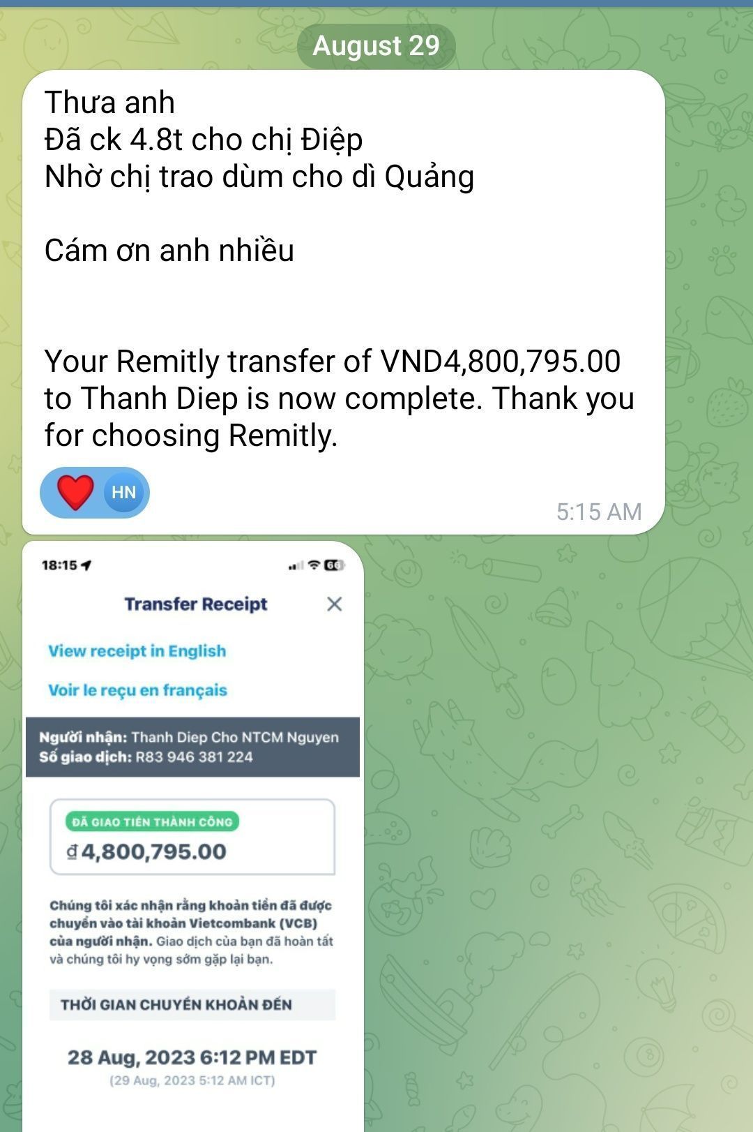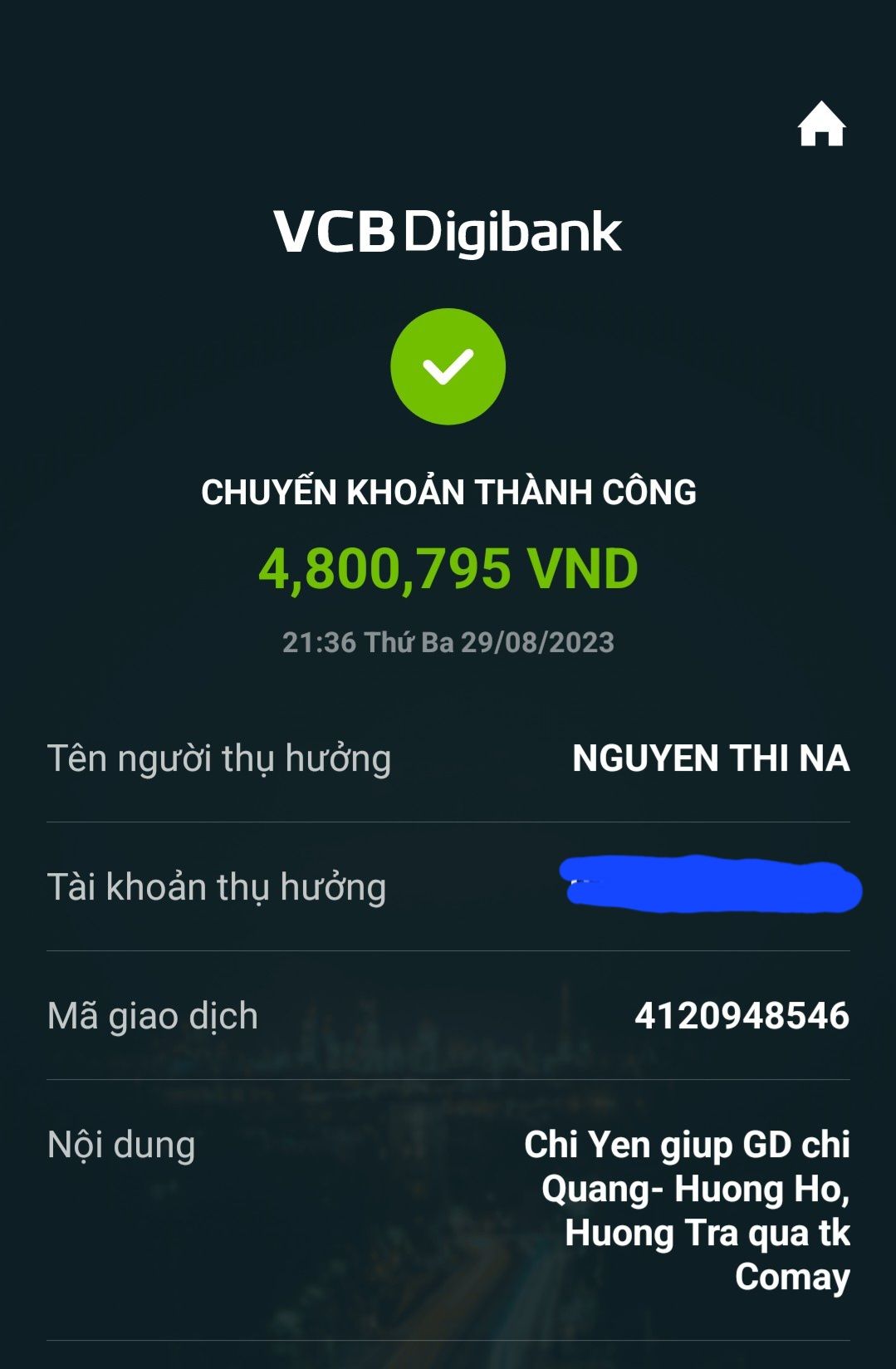 @lathuvang : Lá chuyển 4,800,795₫ của chị Yến tới @comay_a2n dùm nhé.