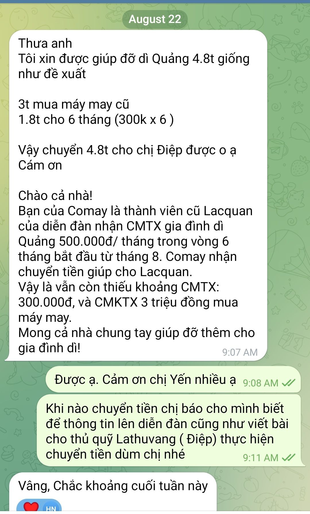 Comay đã chuyển tiền CMTX tháng 8 và 9 với số tiền là 1.600.000đ từ Lacquan và chị Yến đến gia đình dì Quảng. Dì gửi lời cám ơn đến mọi người đã giúp đỡ gia đình suốt thời gian qua.