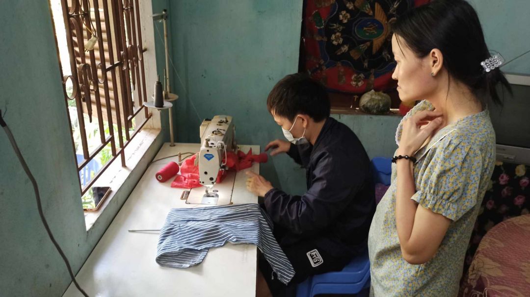 Nhờ có máy may mà em Ái con dì Quảng cũng kiếm thêm được ít thu nhập từ việc sửa áo quần và em ấy xin được một ít vải bỏ đi may các tấm thảm chùi chân bằng vải để bán. Em Ái cũng đang kiếm các đơn hàng để nhận gia công mà chưa có, nên cuộc sống cũng còn khó khăn.