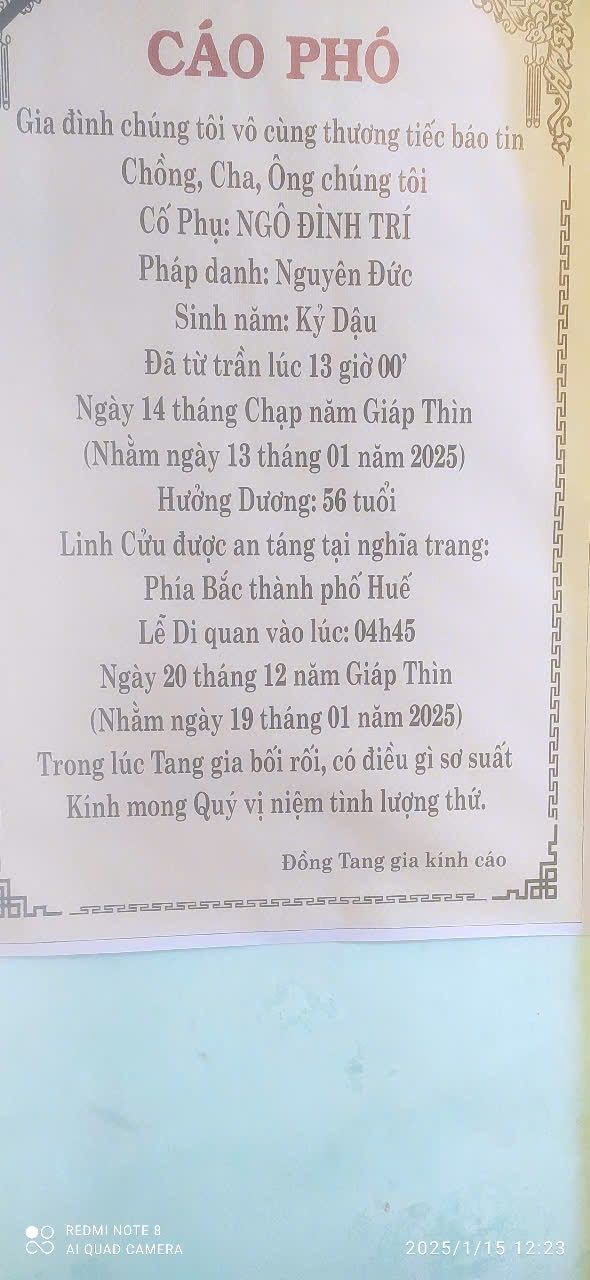 Nhóm Huế dự định viếng tang vào chiều tối mai. 17/01/25