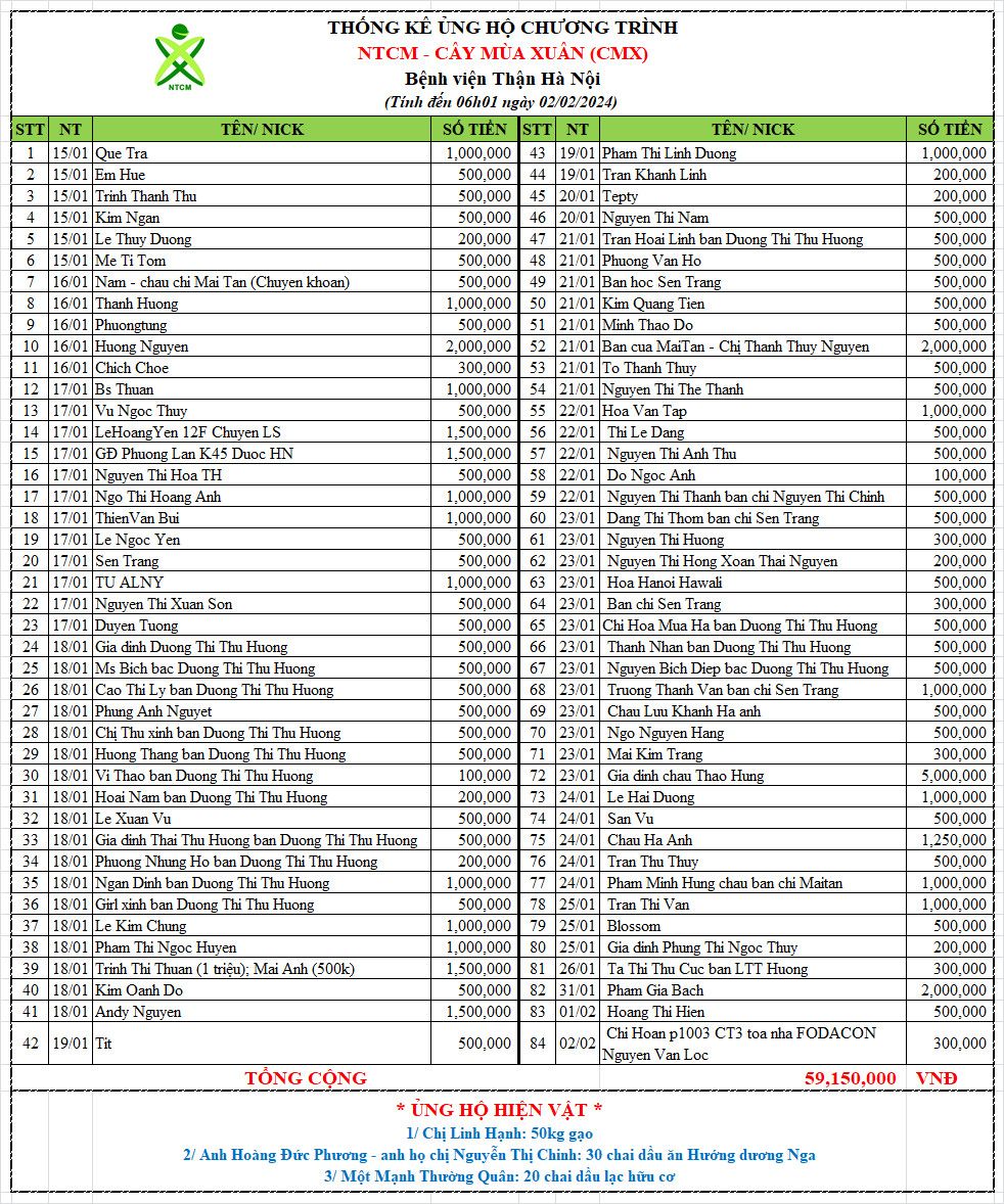 Chương trình Cây mùa xuân viện Thận Hà Nội -Xuân Giáp Thìn đã hoàn thành việc kêu gọi và mua sắm cho Chương trình.