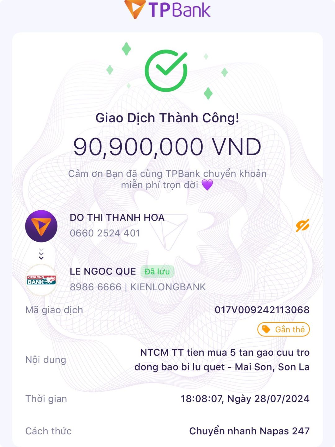 Em đã chuyển 90.900.000đ thanh toán tiền mua 5 tấn gạo cho anh Lê Ngọc Quế.
