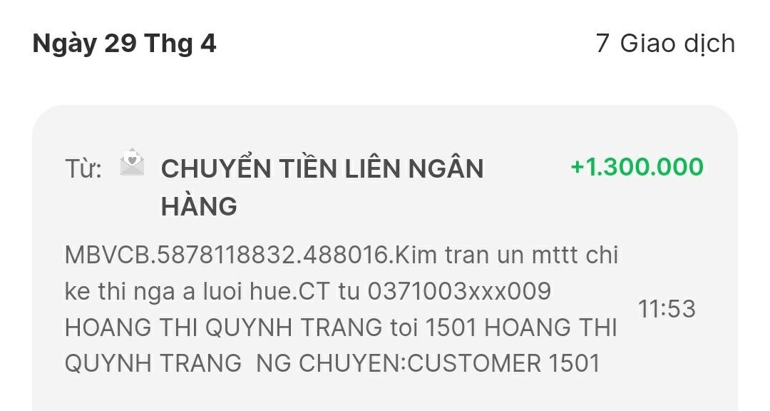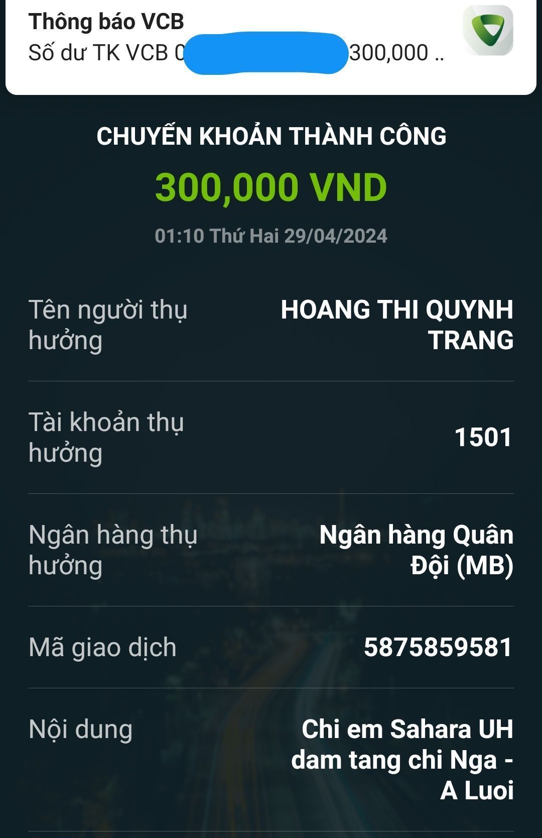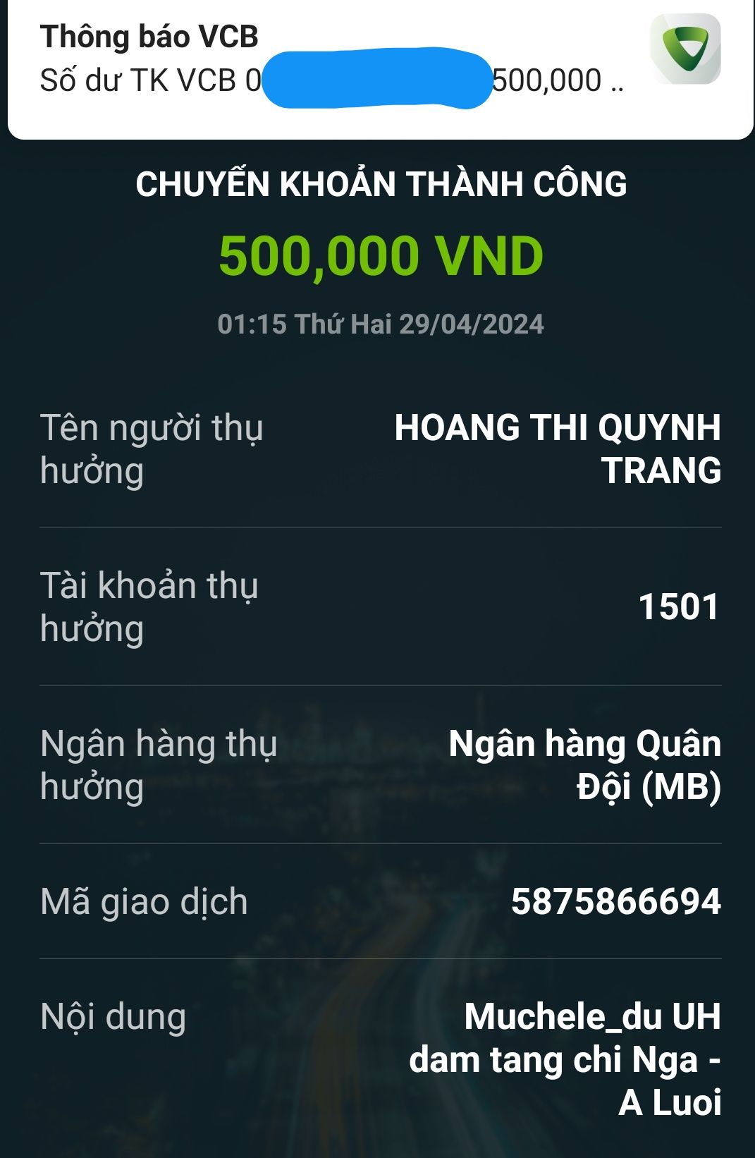 Mọi sự hỗ trợ xin gửi về SỐ TK NTCM: 1501_ HOÀNG THỊ QUỲNH TRANG _ Ngân hàng MB.
