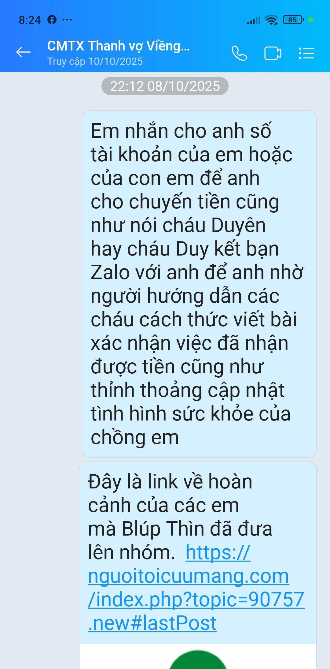 Cháu xin kính chào quý cô chú MTQ! Cháu là Ngọc Anh, sinh viên năm 4 của Đại học Sư phạm Huế. Ngày 04/09/2025 cháu đã đến bệnh viện Trung ương Huế để xác minh hoàn cảnh của anh Hồ Xuân Viềng.