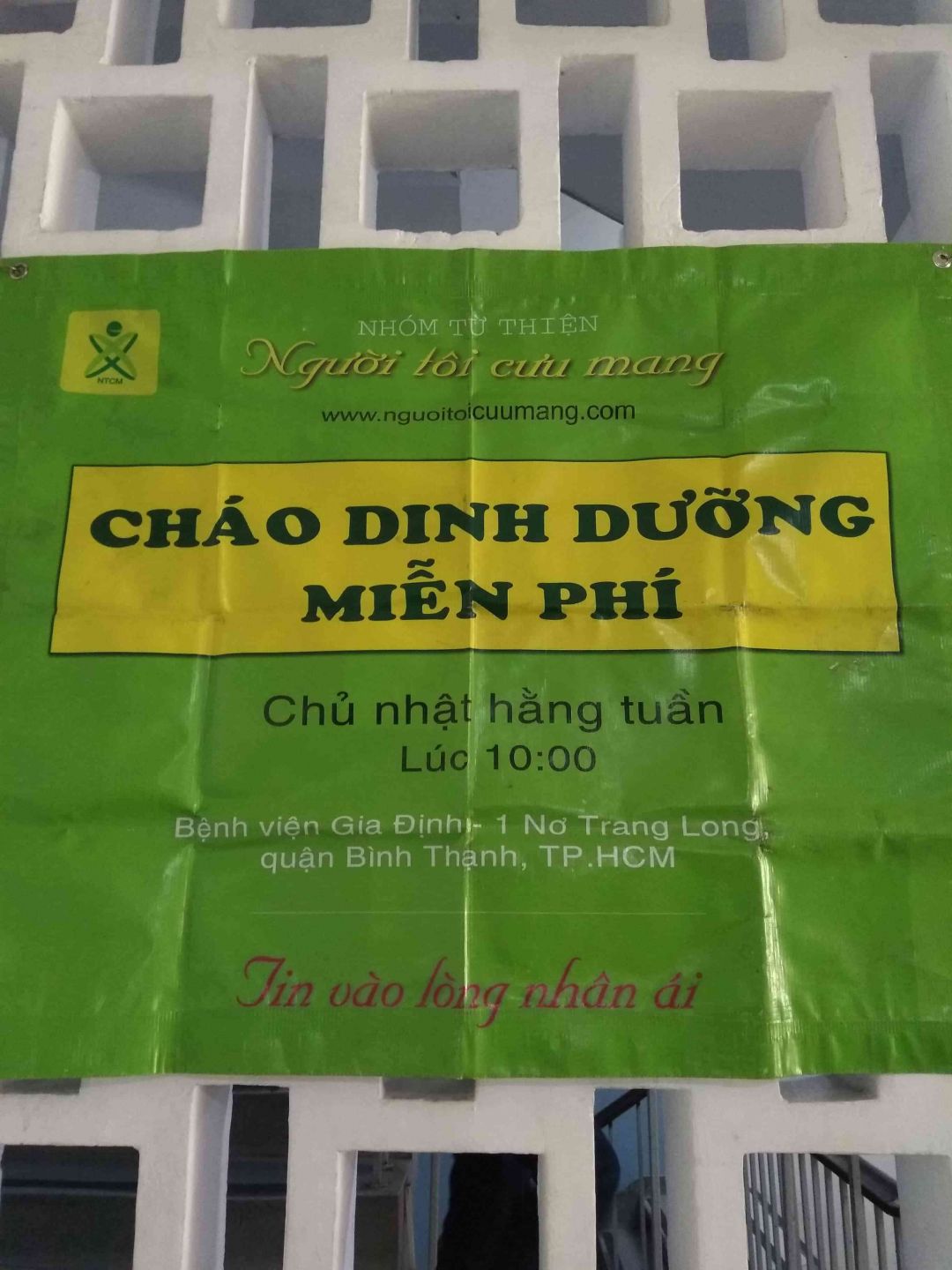 Nửa tiếng sau, chúng tôi hoàn thành nồi cháo. Chúng tôi bắt đầu di chuyển đến bệnh viện "Gia Định" để phát cháo cho bệnh nhân. Tôi cảm thấy háo hức khi được tới đây. Tôi cũng tự nhủ với bản thân sẽ làm thật tốt. Khi tới nơi, tôi thực sự bất ngờ với quang cảnh của bệnh viện. Bệnh viện này là một trong số bệnh viện có thể nói sạch sẽ nhất Sài Gòn. Không những sạch, ở đây còn mát mẻ. Xung quanh hành lang có sẵn quạt cho bệnh nhân dùng...