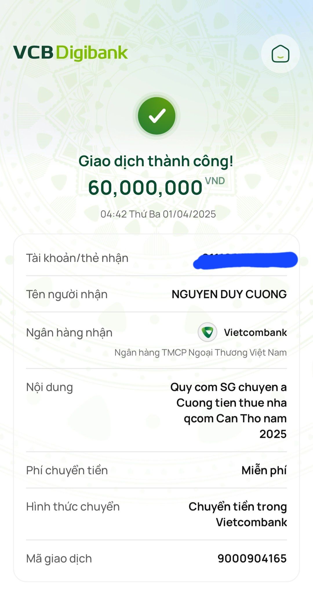 Nhờ cô @lathuvang xuất từ quỹ cơm 2000đ SG, chuyển tiền thuê nhà trong 1 năm tiếp theo cho anh Cường chủ nhà giúp ạ. Tổng số tiền là 60,000,000đ.