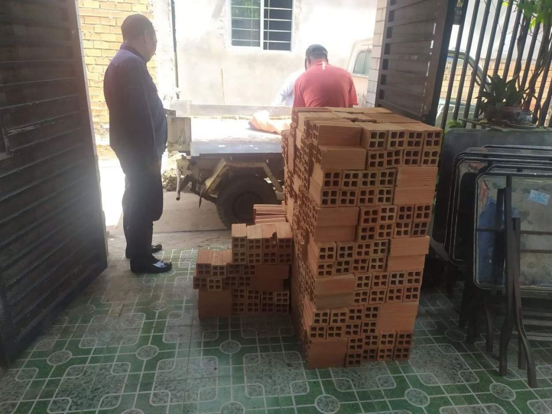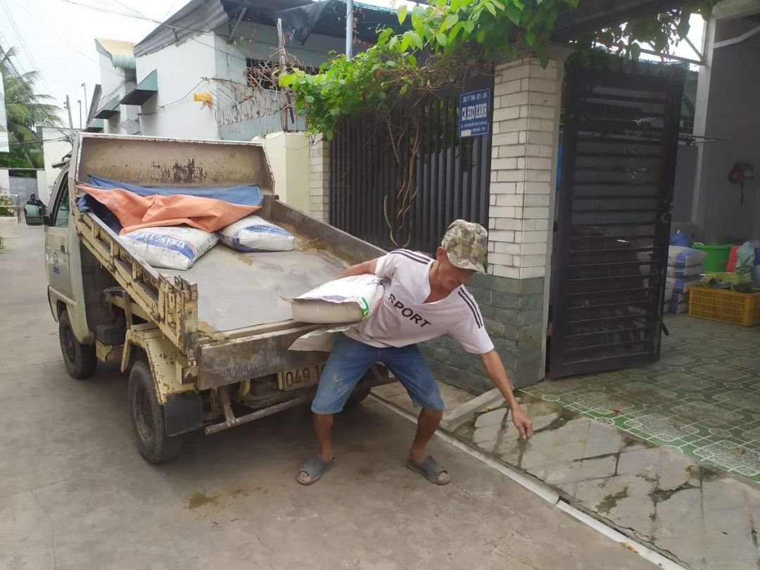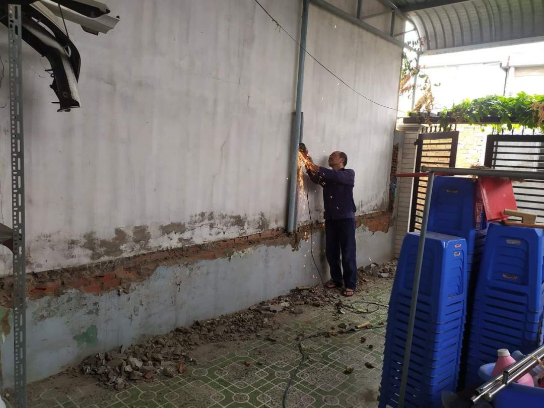 Các bác thợ đã bắt tay vô việc. Đang khoan cắt dở thì bị cup điện từ 08h00 sáng đến giờ vẫn chưa có. Gọi gạch cát xi măng từ sớm mà gần 10h30 người ta mới chuyển đến để làm.