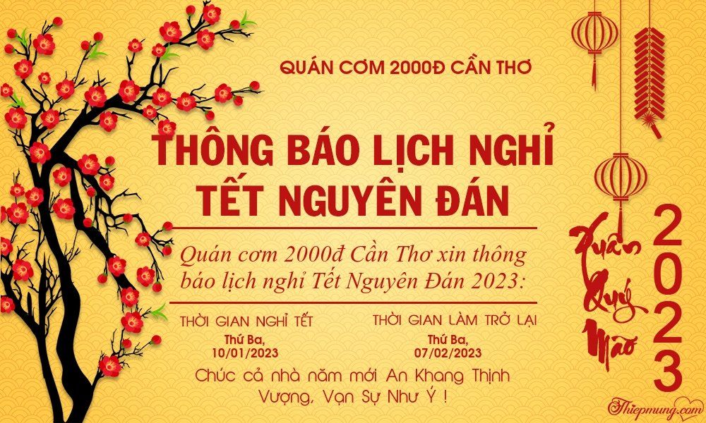Quán cơm 2000đ Cần Thơ xin thông báo lịch nghỉ Tết Quý Mão như sau: