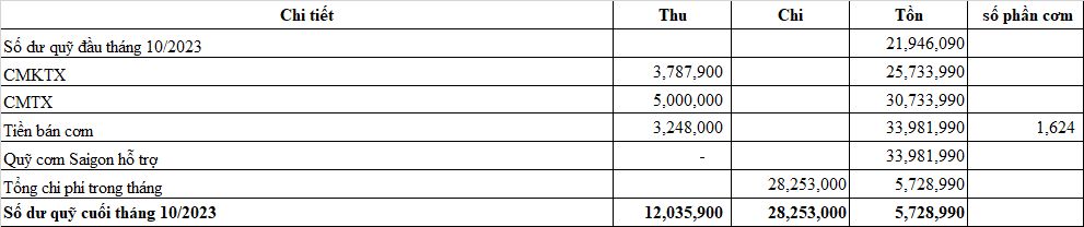Chào cả nhà !Theo Báo cáo Quỹ Quán cơm 2000đ Cần Thơ cuối tháng 8/2023 còn tồn số tiền 6,935,090đ.Mong TĐP duyệt chi hổ trợ từ Quỹ Quán cơm 2000đ SG để hoạt động quán cơm Cần Thơ không bị gián đoạn.https://nguoitoicuumang.com/index.php?topic=90351.msg135494;topicseen#msg135494Xin cảm ơn sự chung tay của cả nhà ! Cảm ơn TĐP !