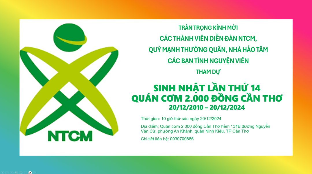 Nhân dịp sinh nhật lần thứ 14 của Quán cơm 2.000 đồng Cần Thơ, Quyen_omon xin được phép mời các thành viên diễn đàn, các mạnh thường quân và các bạn tình nguyện viên về dự buổi tiệc sinh nhật của Quán cơm, diễn ra vào ngày 20 tháng 12 năm 2024.